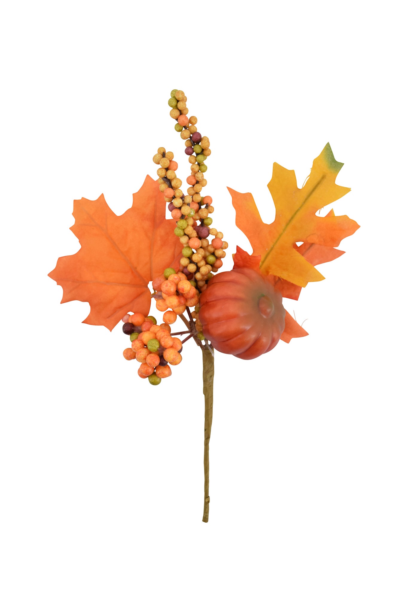 Bring warm harvest charm to your seasonal décor with this 10.5-inch pick, featuring vibrant orange maple leaves, lifelike berries, and a mini pumpkin accent. Perfect for wreaths, centerpieces, or fall floral arrangements, it adds a touch of rustic elegance to any space.