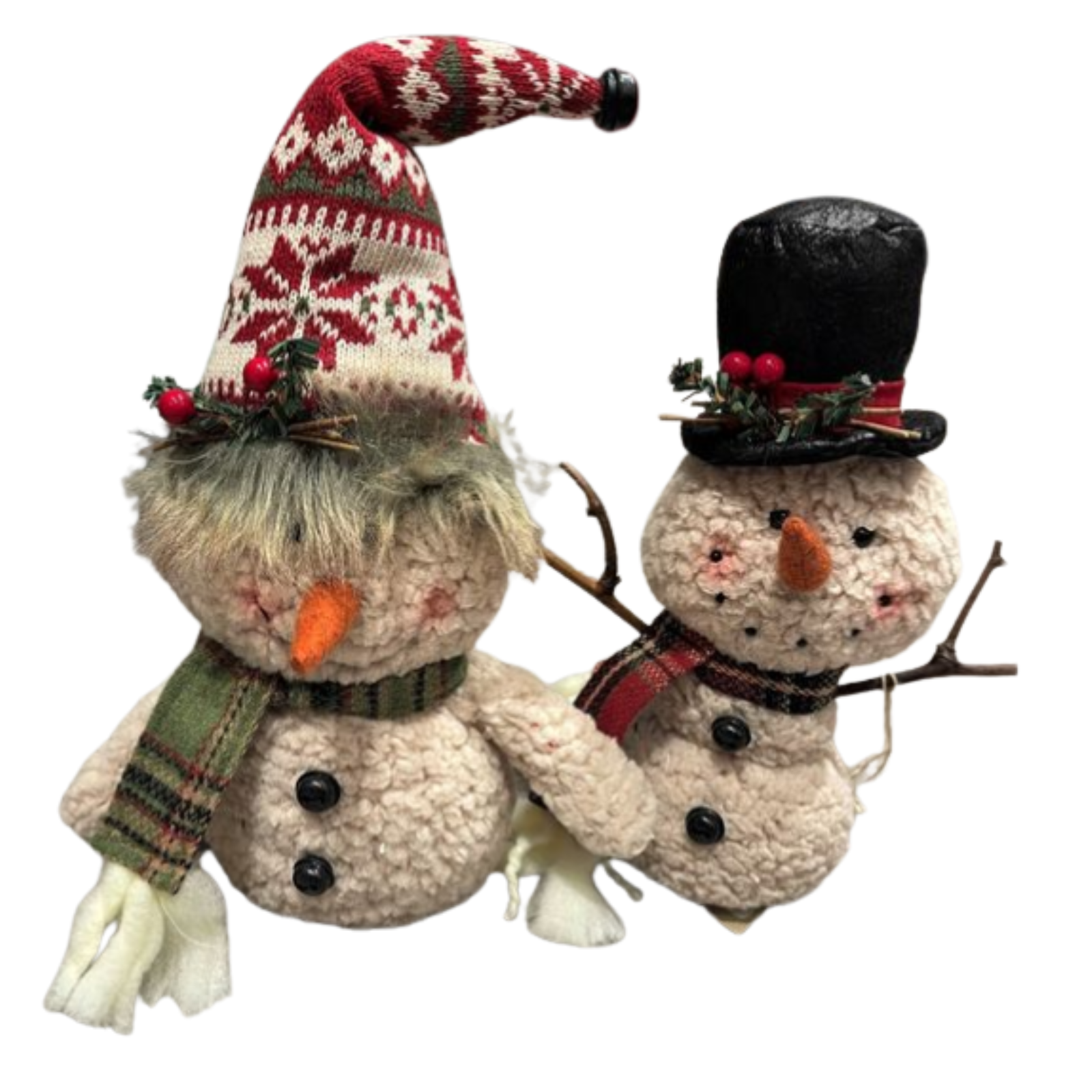 These cozy 10" snowman sitters are full of holiday cheer, featuring soft boucle fabric, plaid scarves, and festive winter hats. Each snowman has its own unique styleone with a tall knit hat and faux fur trim, the other with a classic top hat and twig arms. Perfect for adding a warm, rustic touch to mantels, shelves, or holiday displays.