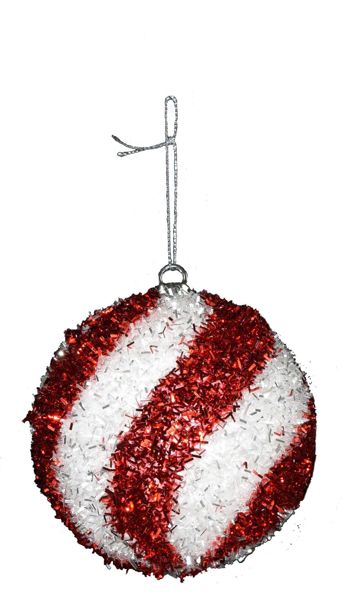 Add a festive candy-cane look to your holiday decor with this set of peppermint stripe ball ornaments. Featuring bold red and white tinsel stripes, these ornaments bring a fun and cheerful touch to Christmas trees, wreaths, and garlands. Packaged in a 4-piece box, theyre lightweight, durable, and perfect for decorating or gifting.
