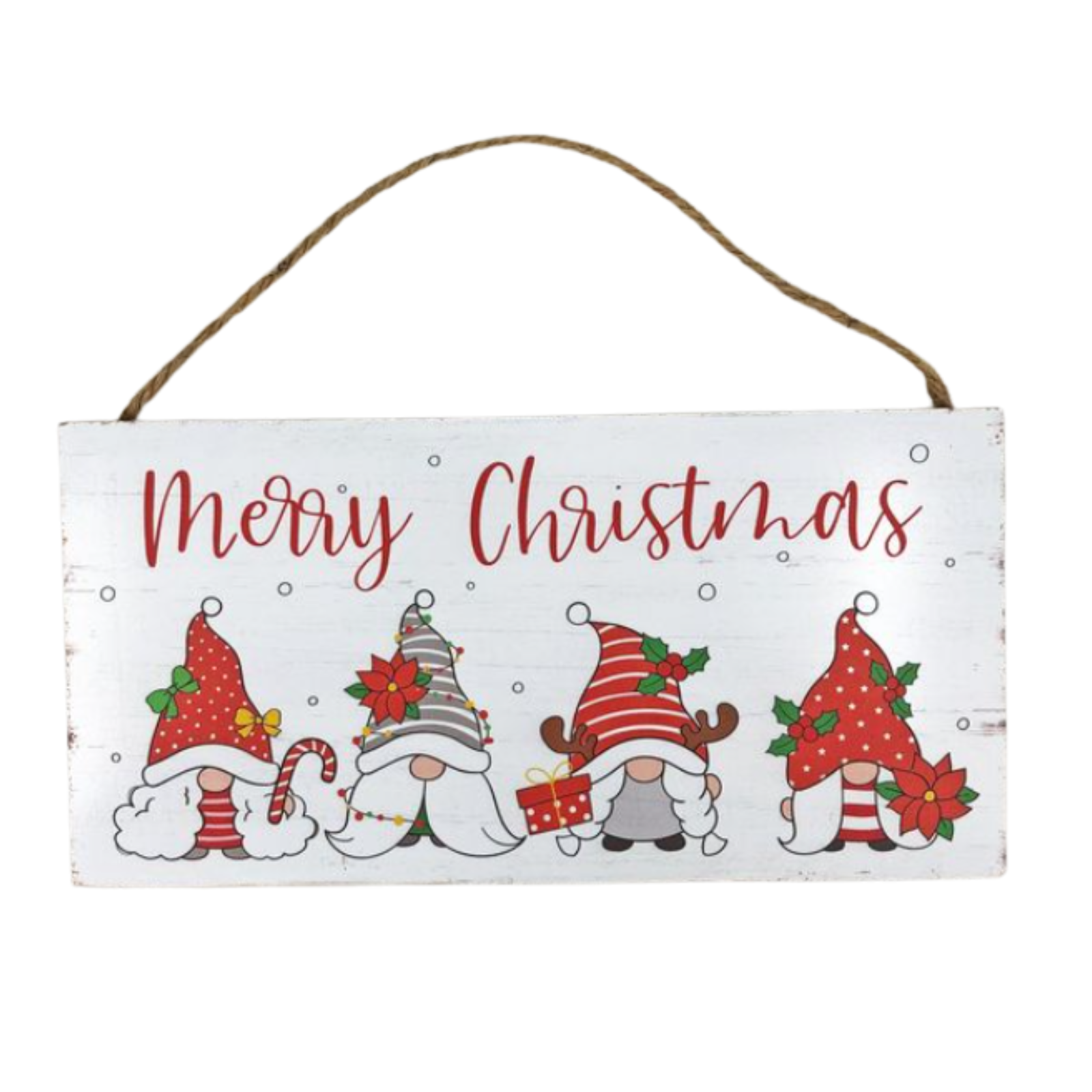 Festive hanging sign crafted from durable wood, featuring a charming holiday-themed design. Complete with a rustic rope hanger, this piece is perfect for adding seasonal cheer to doors, walls, or entryways.