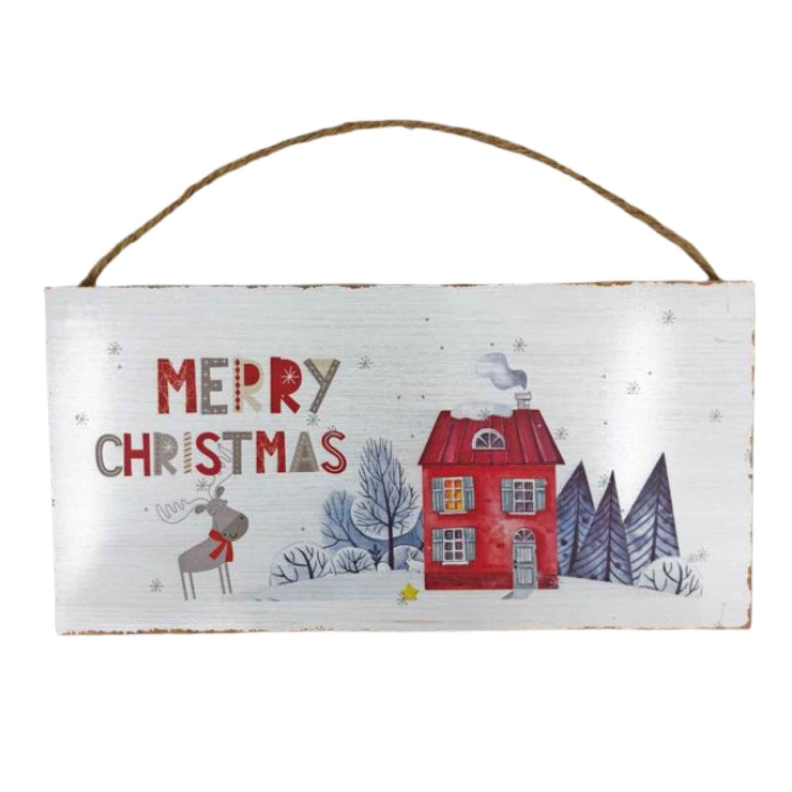 Festive hanging sign crafted from durable wood, featuring a charming holiday-themed design. Complete with a rustic rope hanger, this piece is perfect for adding seasonal cheer to doors, walls, or entryways.