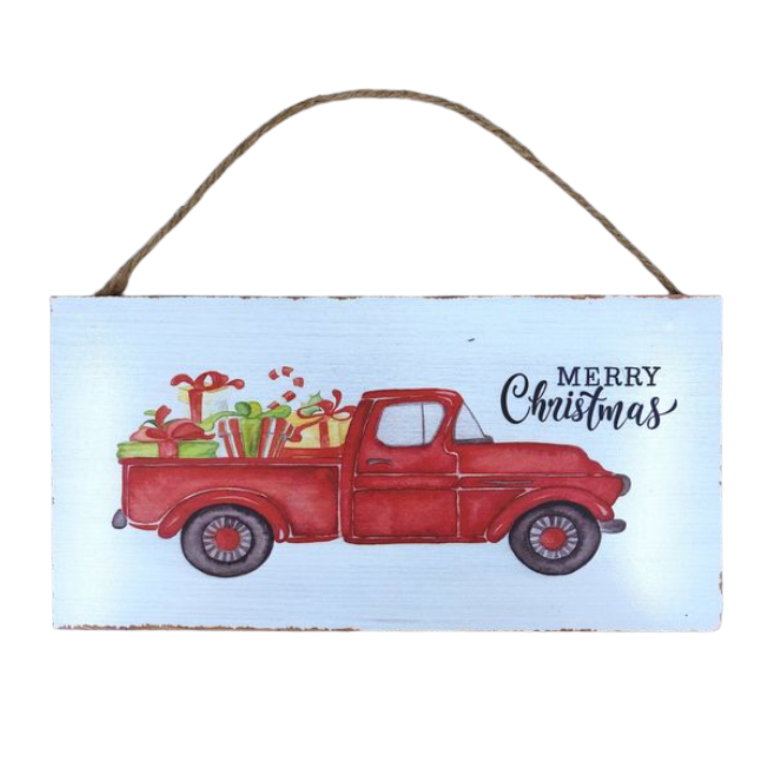 Festive hanging sign crafted from durable wood, featuring a charming holiday-themed design. Complete with a rustic rope hanger, this piece is perfect for adding seasonal cheer to doors, walls, or entryways.