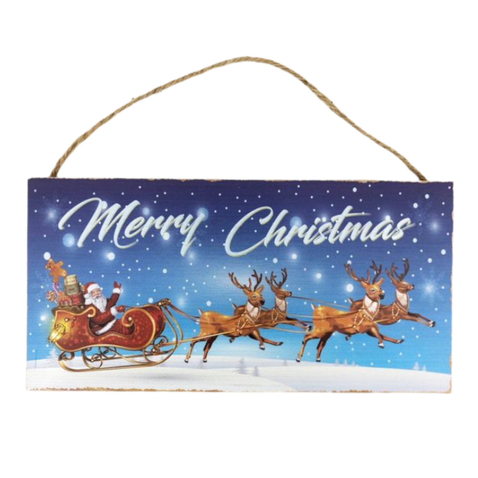 Festive hanging sign crafted from durable wood, featuring a charming holiday-themed design. Complete with a rustic rope hanger, this piece is perfect for adding seasonal cheer to doors, walls, or entryways.