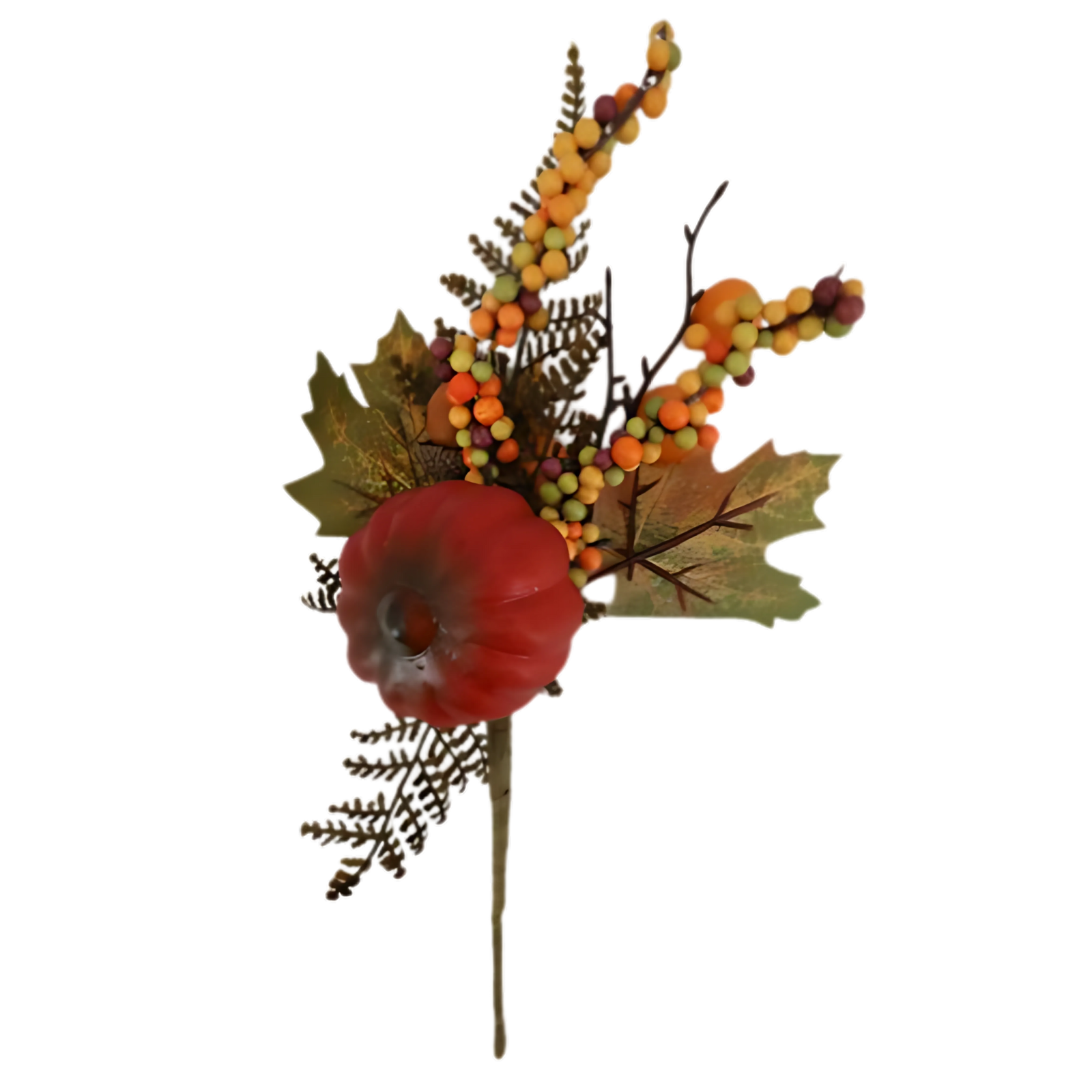 This 11-inch autumn pick features a vibrant pumpkin surrounded by colorful berries, textured maple leaves, and fern accents. Ideal for enhancing wreaths, arrangements, or seasonal displays, it brings a warm and festive harvest touch to your fall decor.