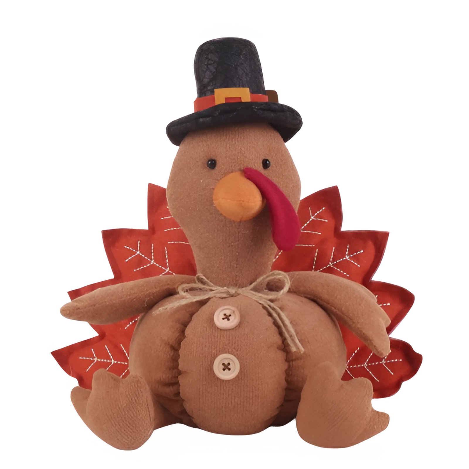Celebrate the season with this charming 12" harvest turkey sitter! Featuring a plush pumpkin-shaped body, stitched leaf wings, button accents, and a pilgrim hat, this festive turkey adds warmth and whimsy to your Thanksgiving decor. Perfect for tabletops, mantels, or entryway displays.