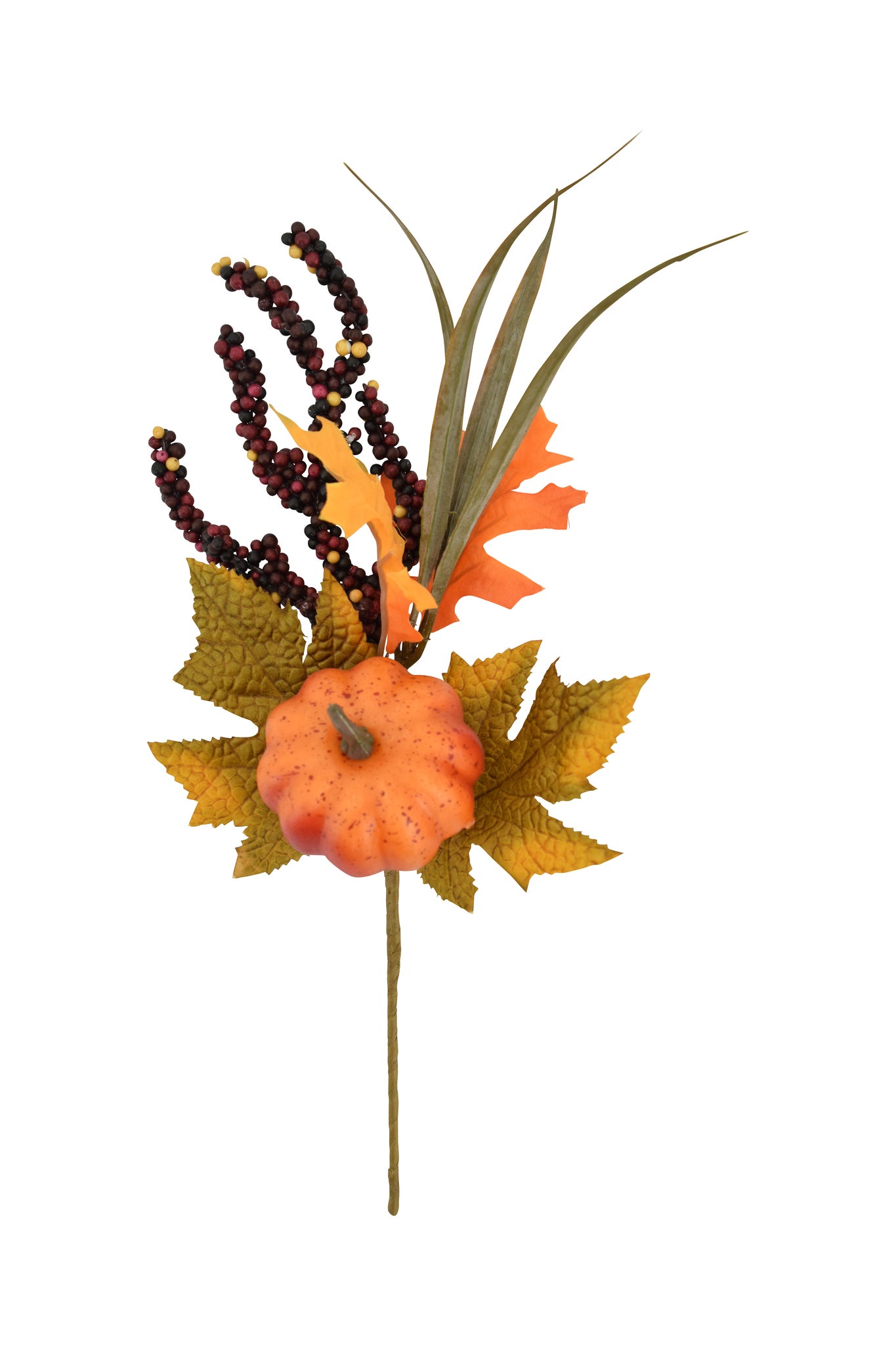 This 13-inch fall pick blends rustic charm with vibrant seasonal color, featuring an orange pumpkin, clusters of dark and golden berries, autumn maple leaves, and slender grass accents. Perfect for adding height and texture to floral arrangements, wreaths, or table centerpieces, it brings a warm harvest touch to any display. Its natural mix of shapes and tones makes it an ideal filler for both farmhouse and contemporary fall decor.