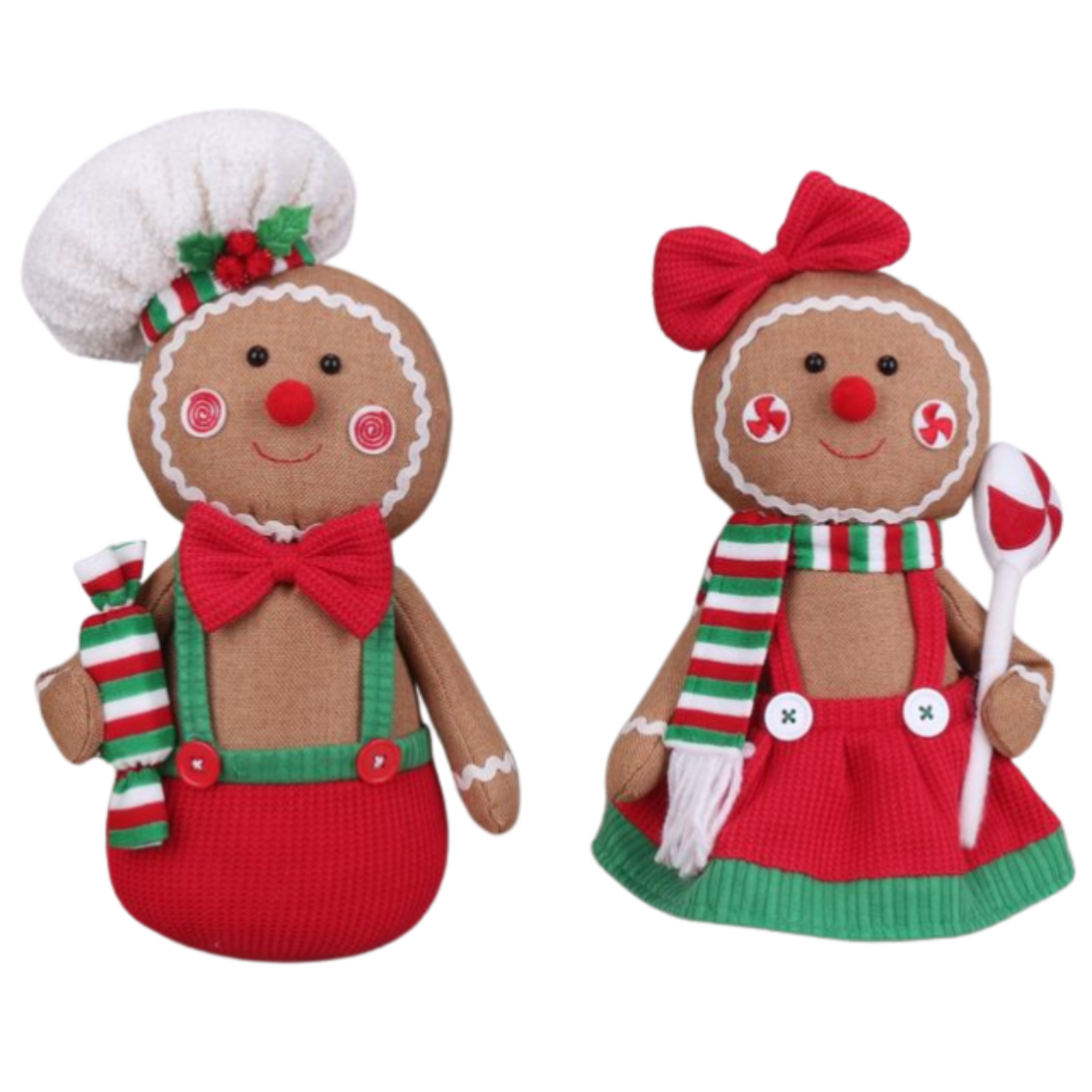 Add a sweet touch to your holiday décor with this set of two 13" gingerbread sitters! Dressed in festive red and green with peppermint accents, one features a chefs hat and candy, while the other wears a bow and scarf with a festive spoon. Perfect for shelves, mantels, or kitchen displays during the Christmas season.