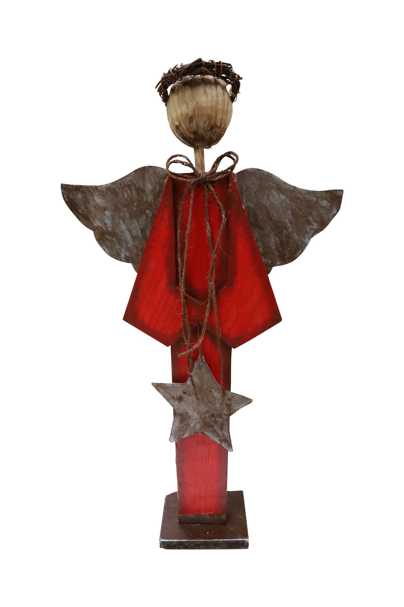 This rustic angel figurine features a red wooden body with distressed brown metal wings and star accent, finished with a twine bow and halo. A charming piece to display on mantels, entryways, or tabletops for a warm holiday touch.