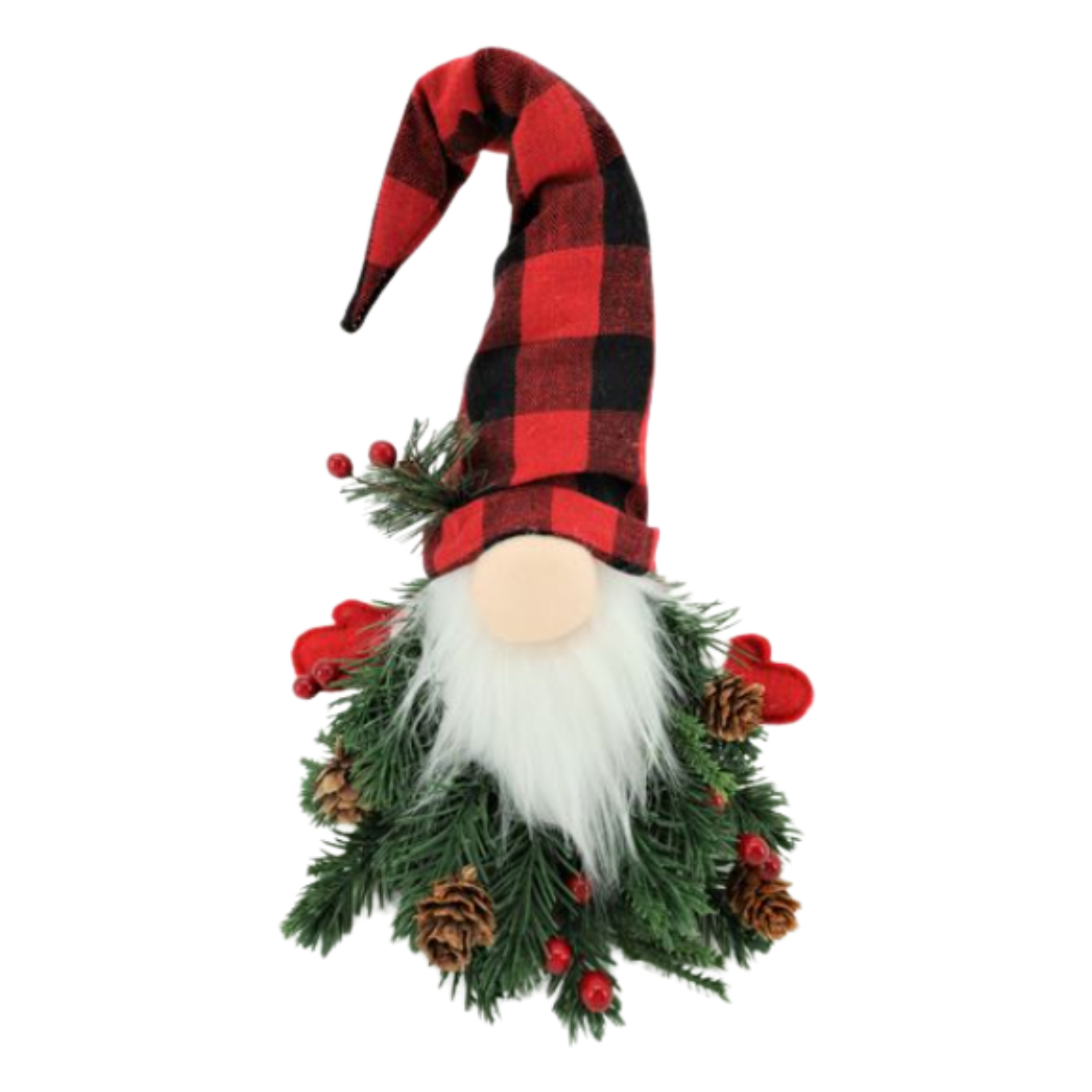 This festive Santa gnome features a classic red and black plaid hat, a fluffy white beard, and seasonal greenery with pinecones and berries. Perfect for adding a rustic holiday touch to mantels, shelves, or tabletops.