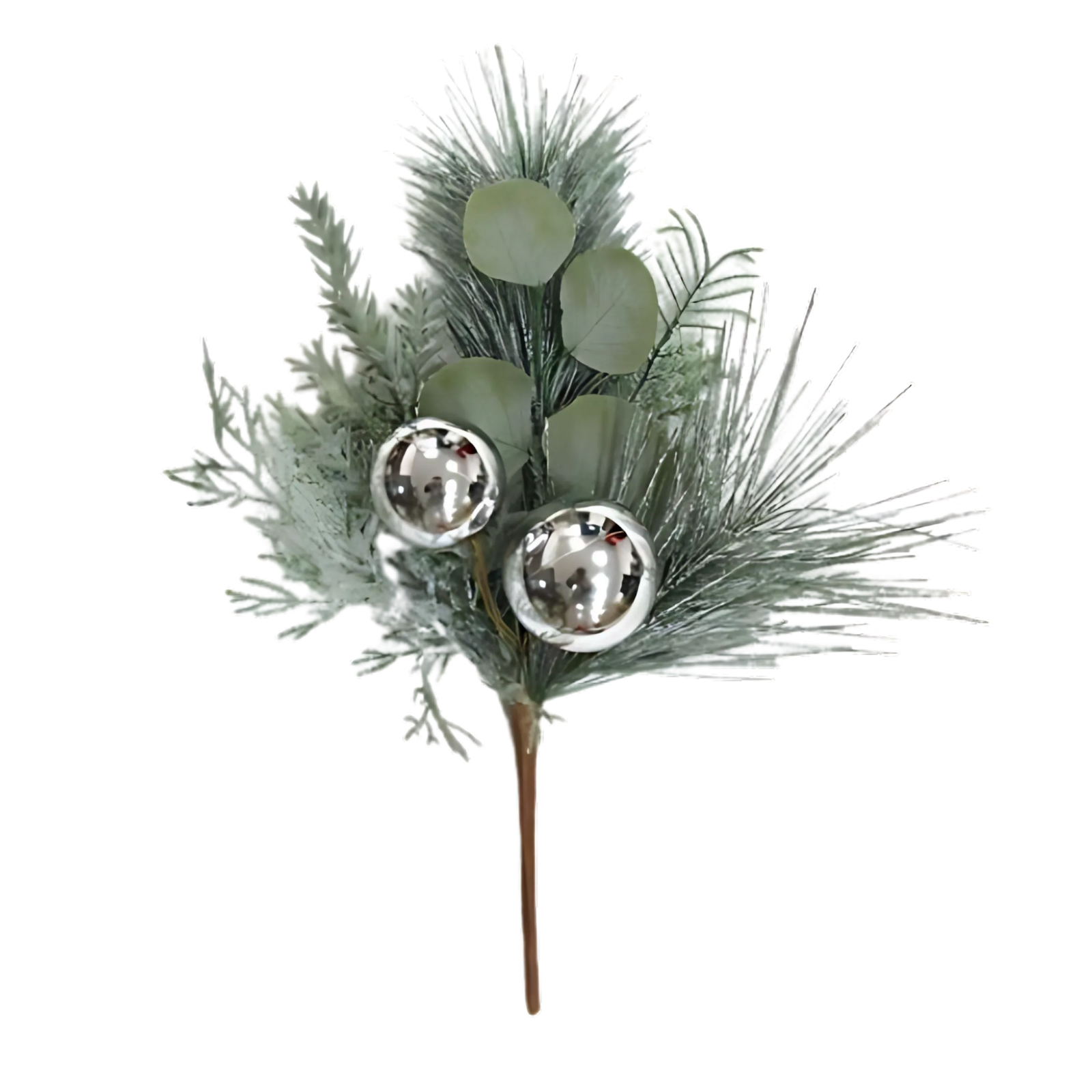 Bring festive flair to your holiday decorating with this ornament pick, featuring lush greenery accented by metallic ball ornaments. Perfect for tucking into wreaths, garlands, arrangements, or Christmas trees, it adds a stylish and seasonal touch. A versatile piece that blends beautifully with both traditional and modern holiday decor.