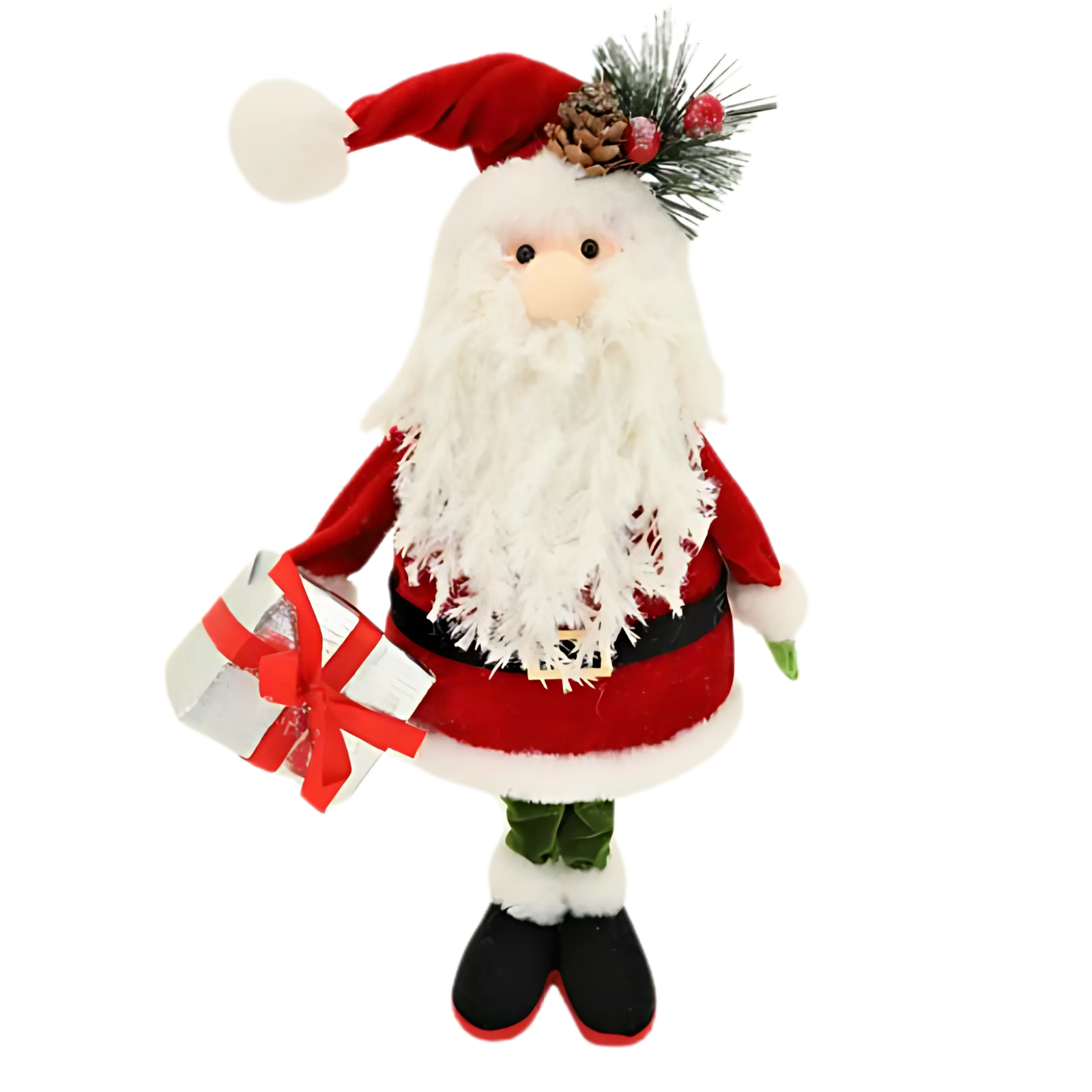 This festive Santa figurine features a classic red suit, long white beard, and holiday accents, including a present and greenery. Perfect for adding a cheerful and traditional touch to mantels, entryways, or seasonal displays.