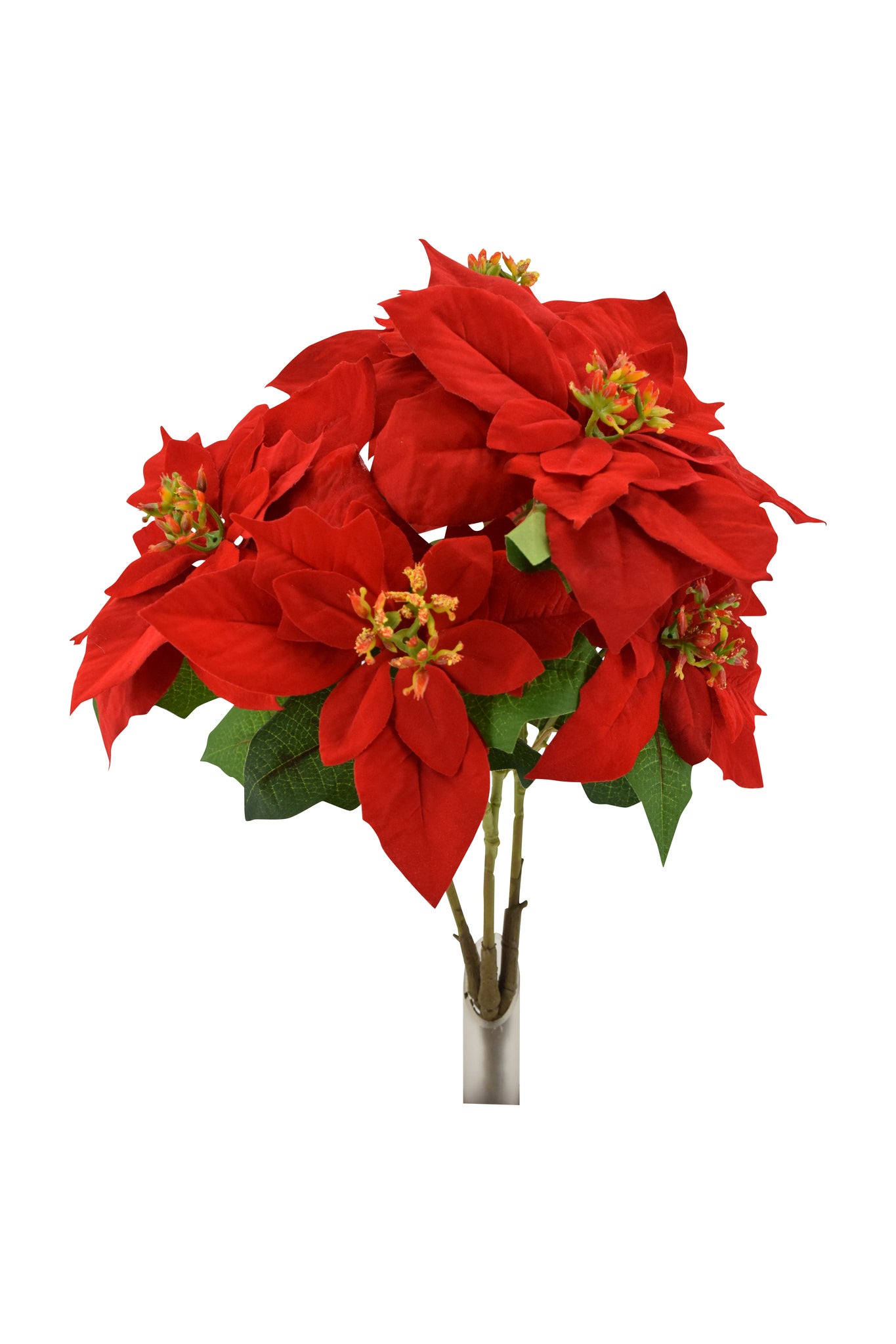 This bold 17" poinsettia bush features multiple rich red blooms with vibrant green foliage, creating a striking seasonal accent. Best displayed in a decorative vase, urn, or large floor container to showcase its full height and fullness.