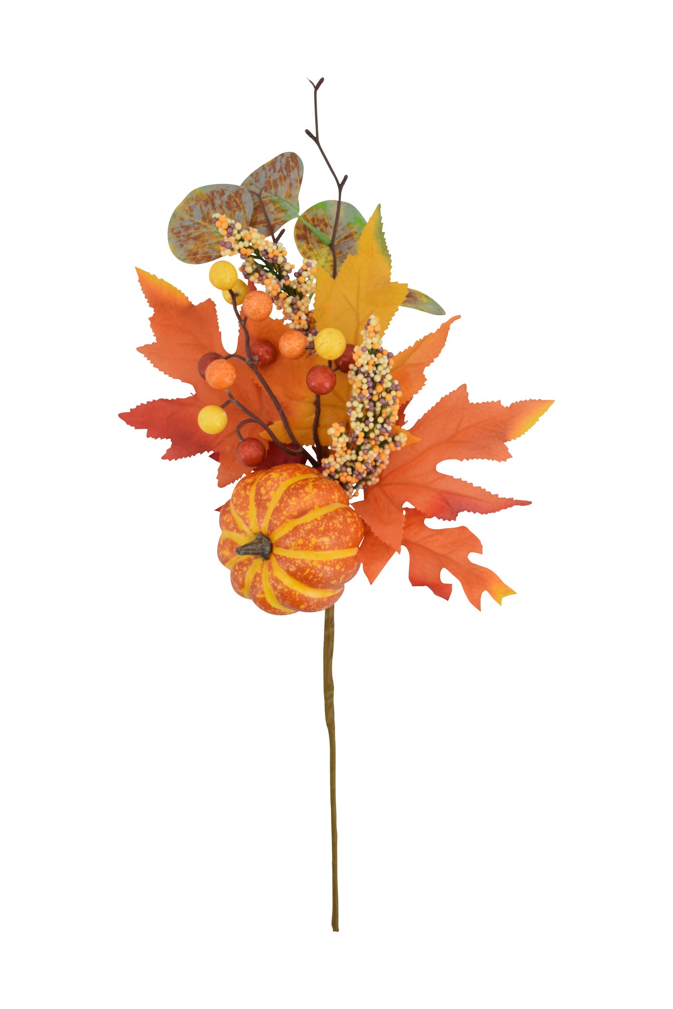 Celebrate the beauty of fall with this vibrant spray, featuring a striped mini pumpkin, clusters of colorful berries, and lush maple leaves in warm seasonal tones. Perfect for adding a festive touch to wreaths, centerpieces, or fall floral arrangements.