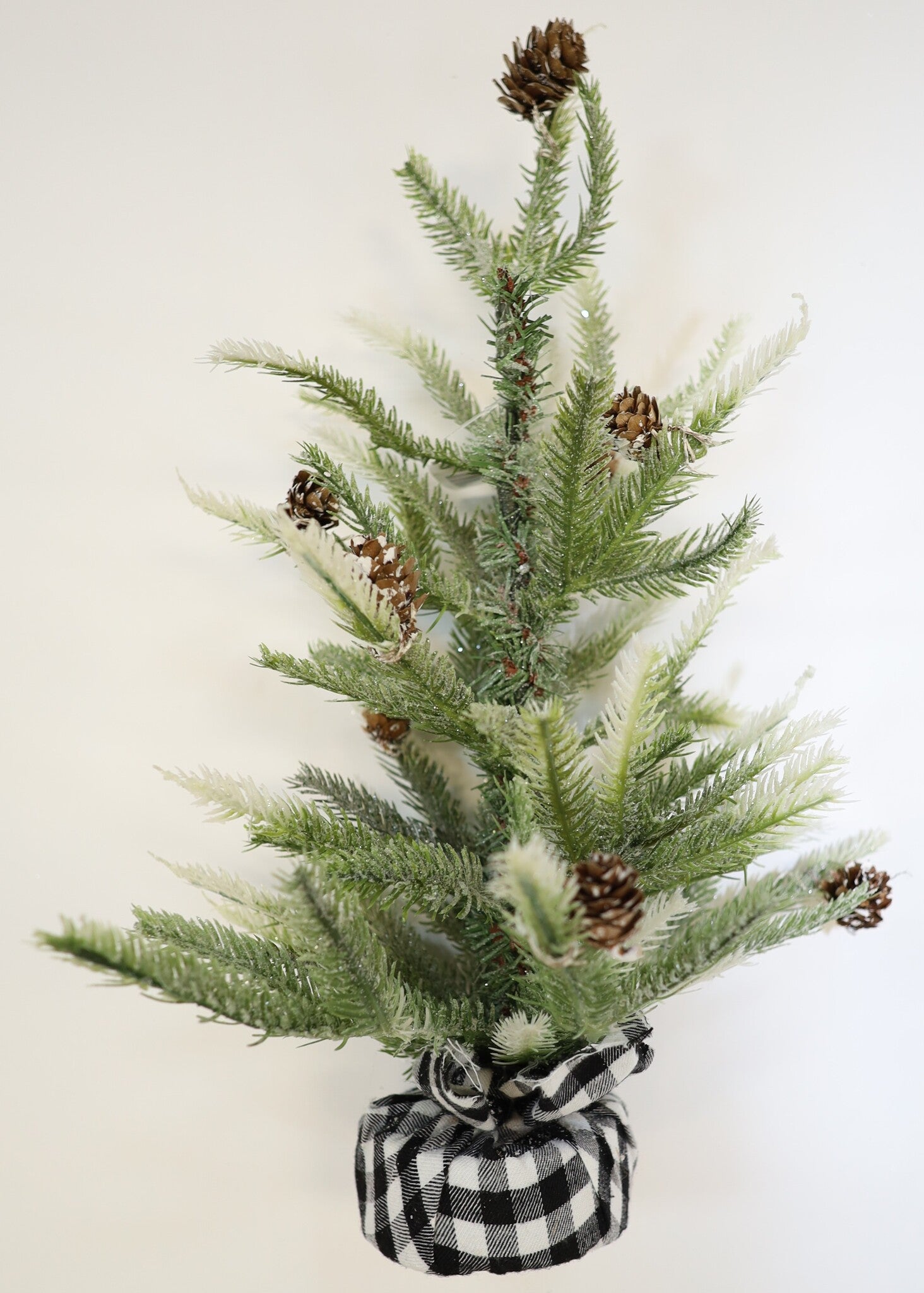 Add a cozy, wintry touch to your décor with this 18-inch Frosted Tree. Featuring lightly frosted branches, natural pinecones, and a black-and-white plaid cloth wrapped base, this tree brings rustic charm to mantels, tabletops, or entryways. A perfect accent piece for creating a festive holiday atmosphere.