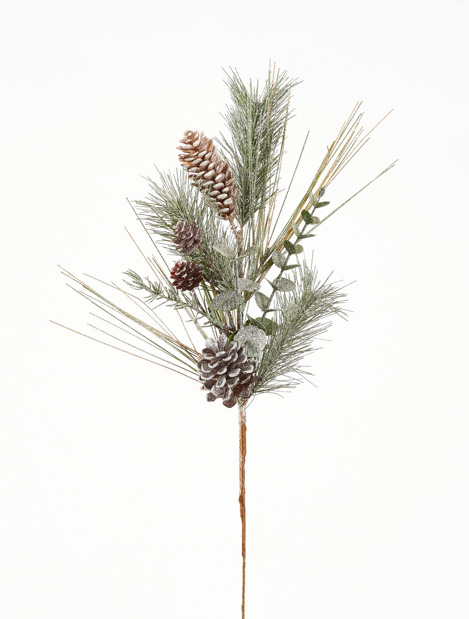 This 19" pinecone eucalyptus spray combines rustic charm with a natural look, featuring frosted greenery, pinecones, and eucalyptus accents. Perfect for adding seasonal texture to wreaths, garlands, arrangements, or holiday centerpieces. A versatile piece that brings a touch of winter beauty indoors.