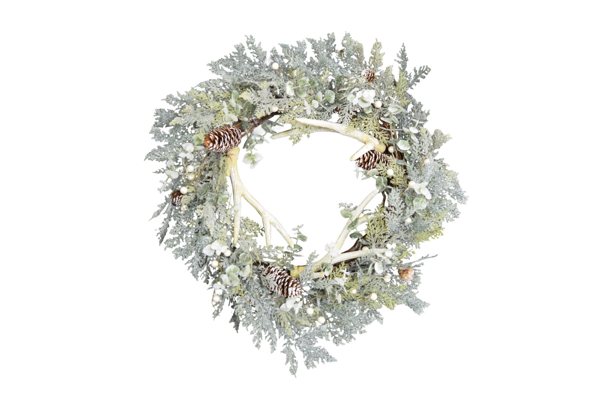This 20-inch wreath combines frosted cedar pine greenery with rustic pinecones, white florals, and decorative antlers for a woodland-inspired holiday accent. Its natural textures and wintry tones make it a perfect addition to farmhouse or lodge-style décor.