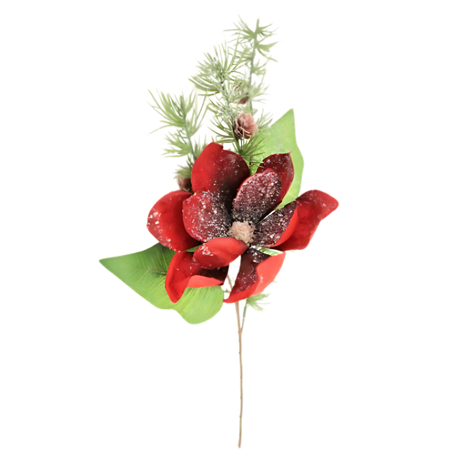 Add elegance to your seasonal decor with this frosted magnolia spray, featuring bold red magnolia blooms accented with pine greenery. The frosted finish creates a festive, wintry look, making it perfect for enhancing arrangements, wreaths, or holiday centerpieces. A versatile piece that brings both color and texture to your Christmas displays.