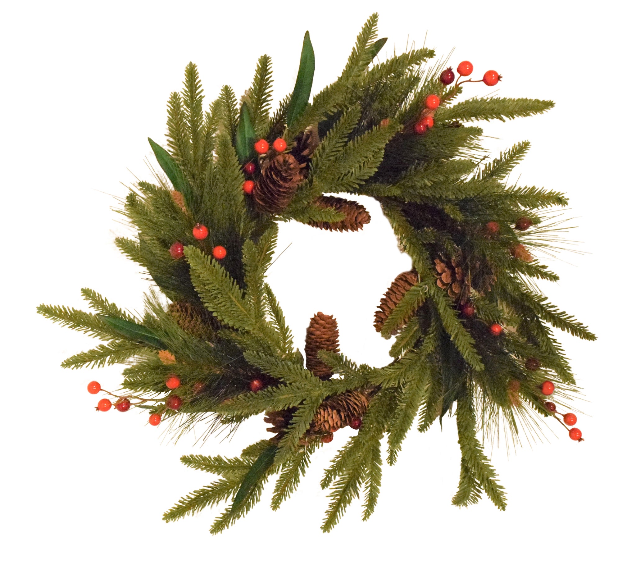 This 22-inch wreath blends spruce, cedar, and eucalyptus for a lush, textured look that feels both natural and festive. Accented with pinecones and red berry clusters, it brings seasonal charm with a hint of rustic elegance. Whether displayed indoors or outdoors, this wreath makes a beautiful statement on doors, walls, or mantels throughout the holiday season.