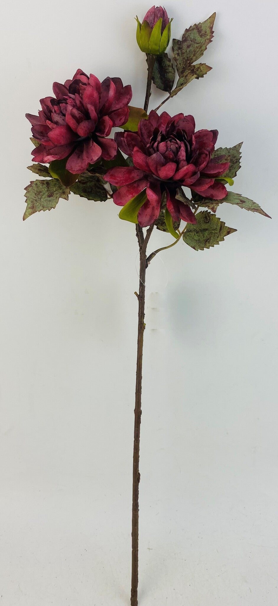 This striking dahlia spray features two full burgundy blooms with a natural bud and realistic green foliage. Perfect for adding rich color and texture to fall arrangements, centerpieces, or seasonal décor.