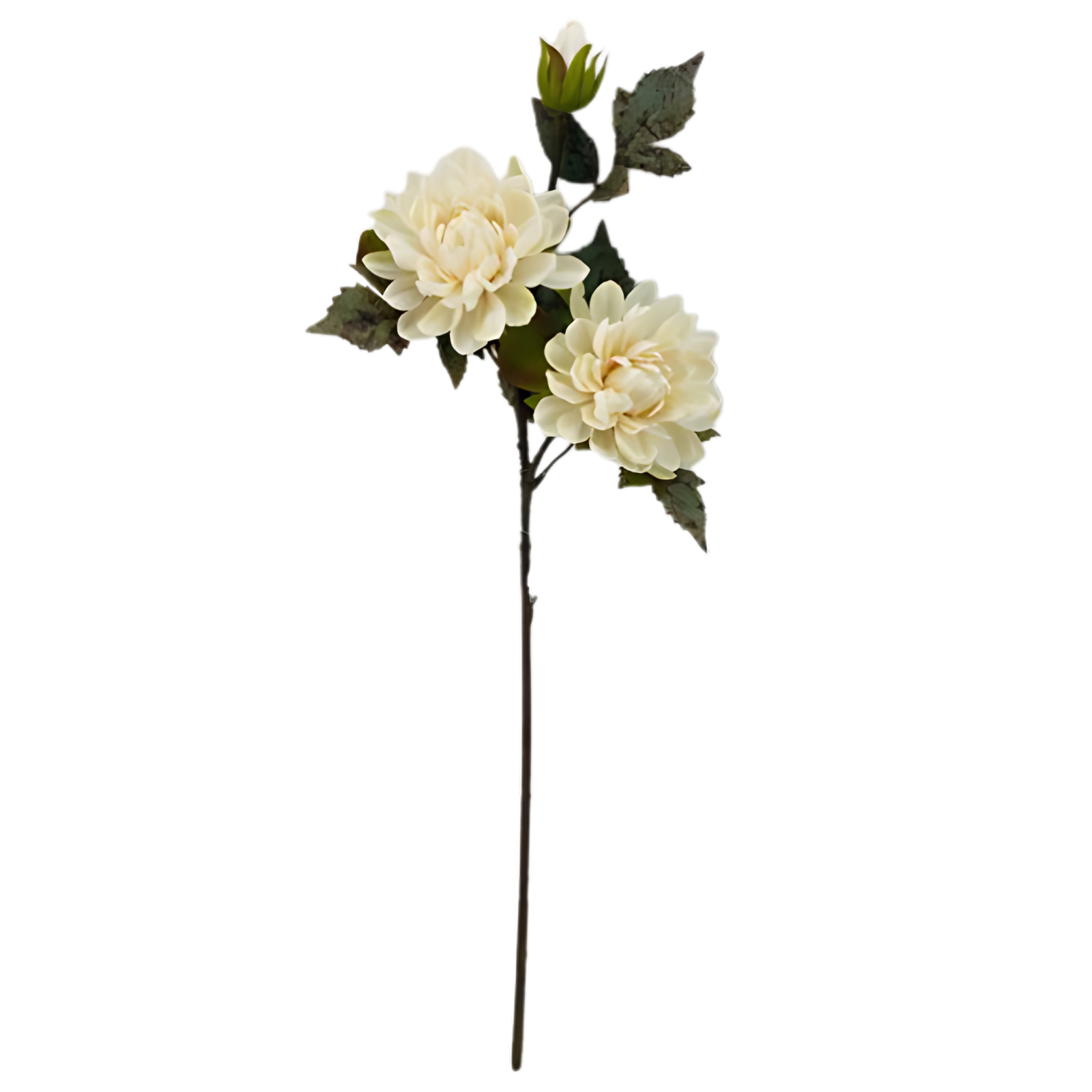 Add timeless elegance to any floral arrangement with this lifelike cream dahlia spray. Featuring two full blooms, a budding flower, and textured green leaves, this 22-inch stem brings a soft, romantic touch to centerpieces, wreaths, and seasonal décor. Perfect for both everyday and event displays.