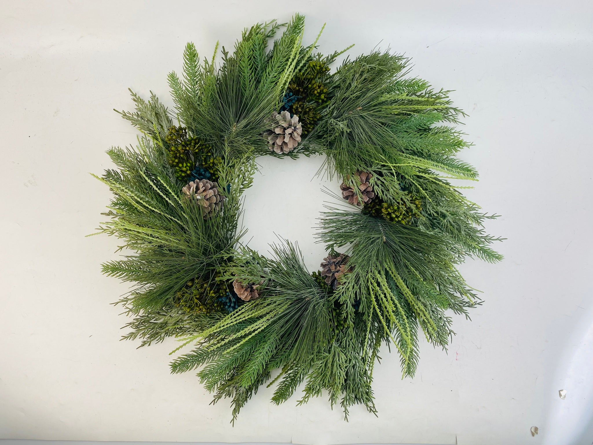 Add a natural woodland touch to your seasonal décor with this 24-inch wreath crafted from a lush blend of fir and cedar greenery. Accented with pinecones for rustic charm, this wreath brings a fresh, layered look perfect for doors, mantels, or wall displays.
