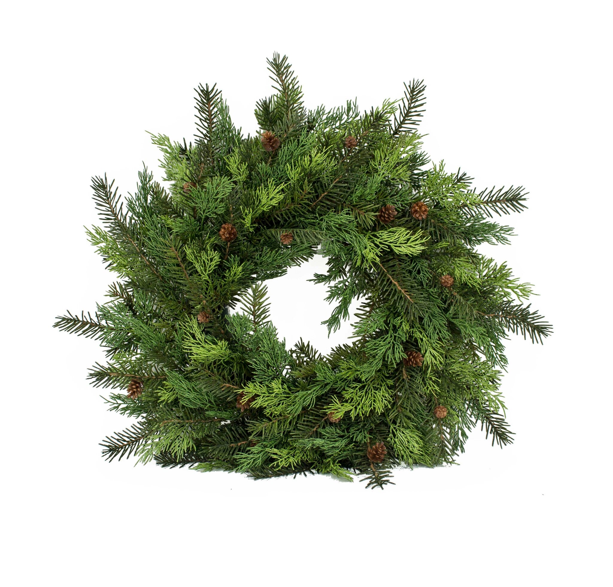 The 24-inch Mixed Cedar Wreath brings natural woodland charm with its lush blend of cedar greenery and small pinecone accents. Its full, layered texture offers a realistic look that works beautifully for holiday decorating or year-round rustic style.