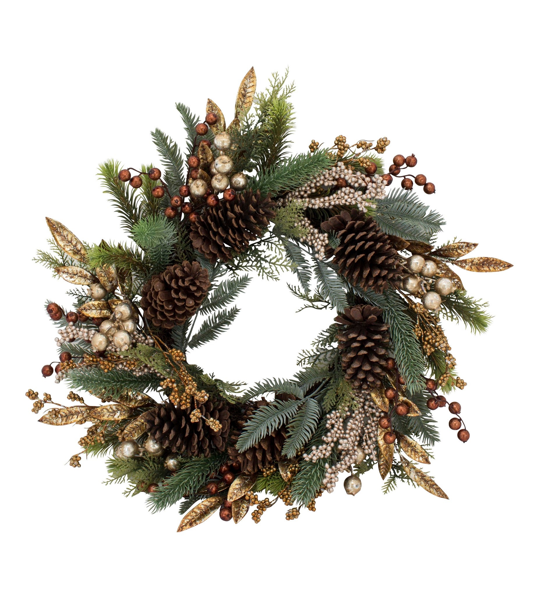 The 24-inch Pinecone & Tea Leaves Wreath combines natural elegance with festive accents. Featuring lifelike greenery, rich pinecones, clusters of tea leaves, and gold-dusted berries, this wreath creates a warm and sophisticated seasonal display.
