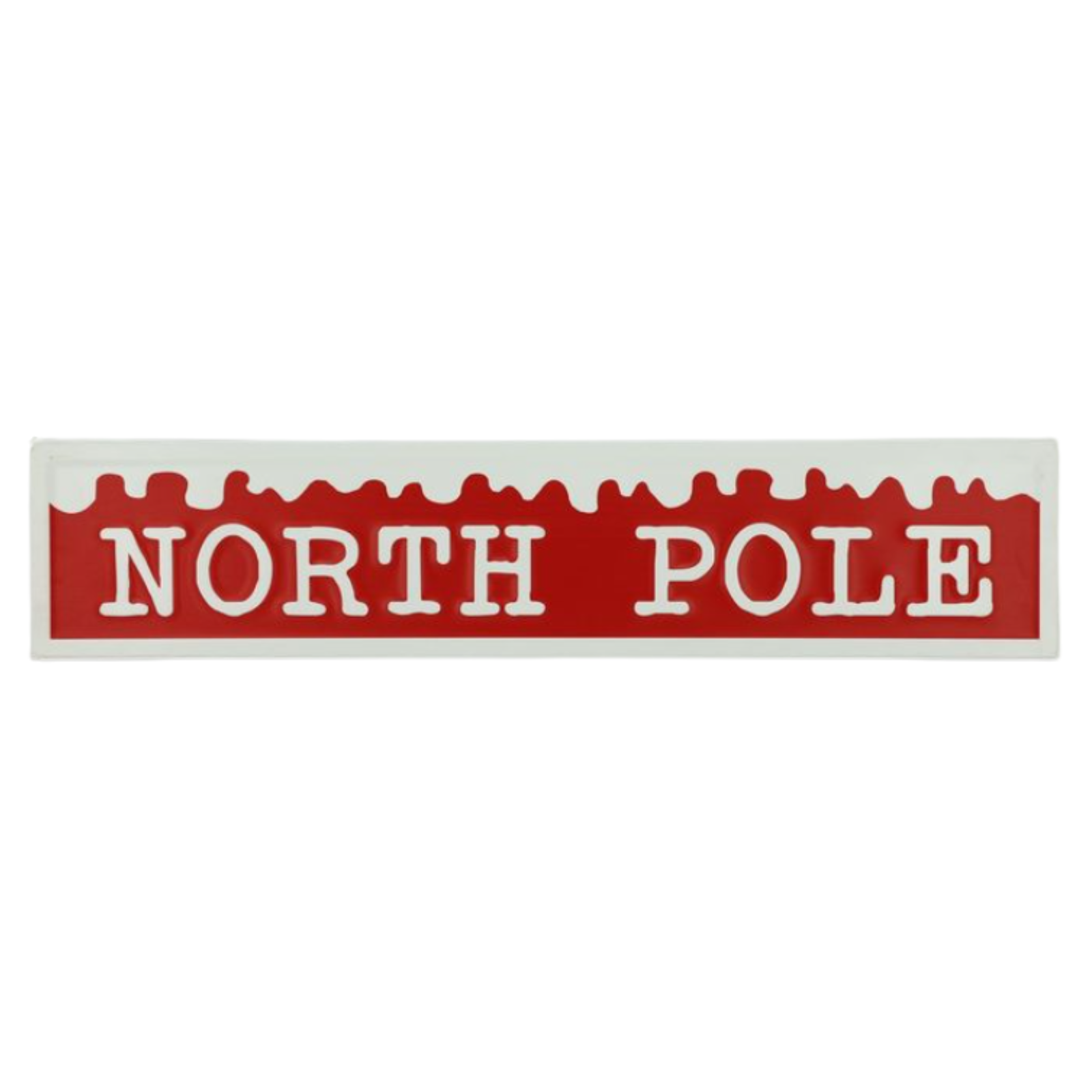 Add festive charm to your holiday décor with this bold red and white "North Pole" metal plaque. Featuring a snowy top design, its perfect for hanging on a wall, door, or entryway to welcome guests with Christmas cheer.