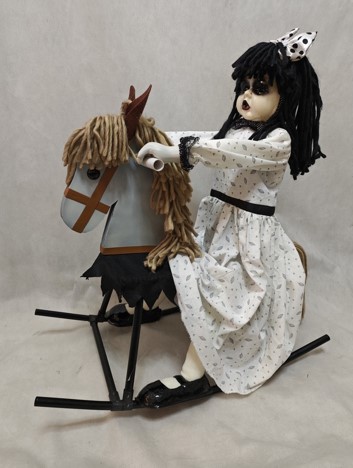 This eerie 28-inch animated display features a gothic-style doll riding a rocking horse with lifelike motion. Dressed in a vintage-style dress and black wig, the doll moves with a haunting presenceperfect for adding a spooky touch to your Halloween decor or haunted display. Battery-operated and sure to capture attention!