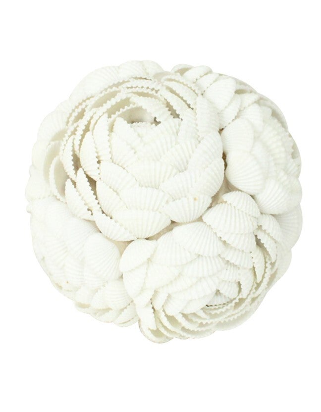 This White Shell Ball is a beautifully crafted decorative piece, featuring delicate white seashells intricately arranged in a captivating, layered pattern. The shells are arranged with precision to create a harmonious, flower-like design, giving the piece an elegant and serene coastal feel that brings the essence of the beach indoors.