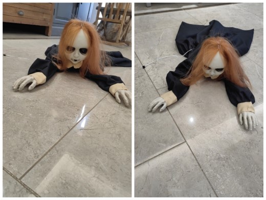 Creep into your guests nightmares with this 35-inch animated crawling ghost doll, complete with lifelike red hair, pale skull-like face, and outstretched skeletal hands. When motion triggers its eerie forward crawl, the dolls haunting gaze and rustling fabric create an unsettling, immersive effectperfect for entryways, dark hallways, or haunted house displays. Battery-operated and easy to position, it delivers spine-tingling.