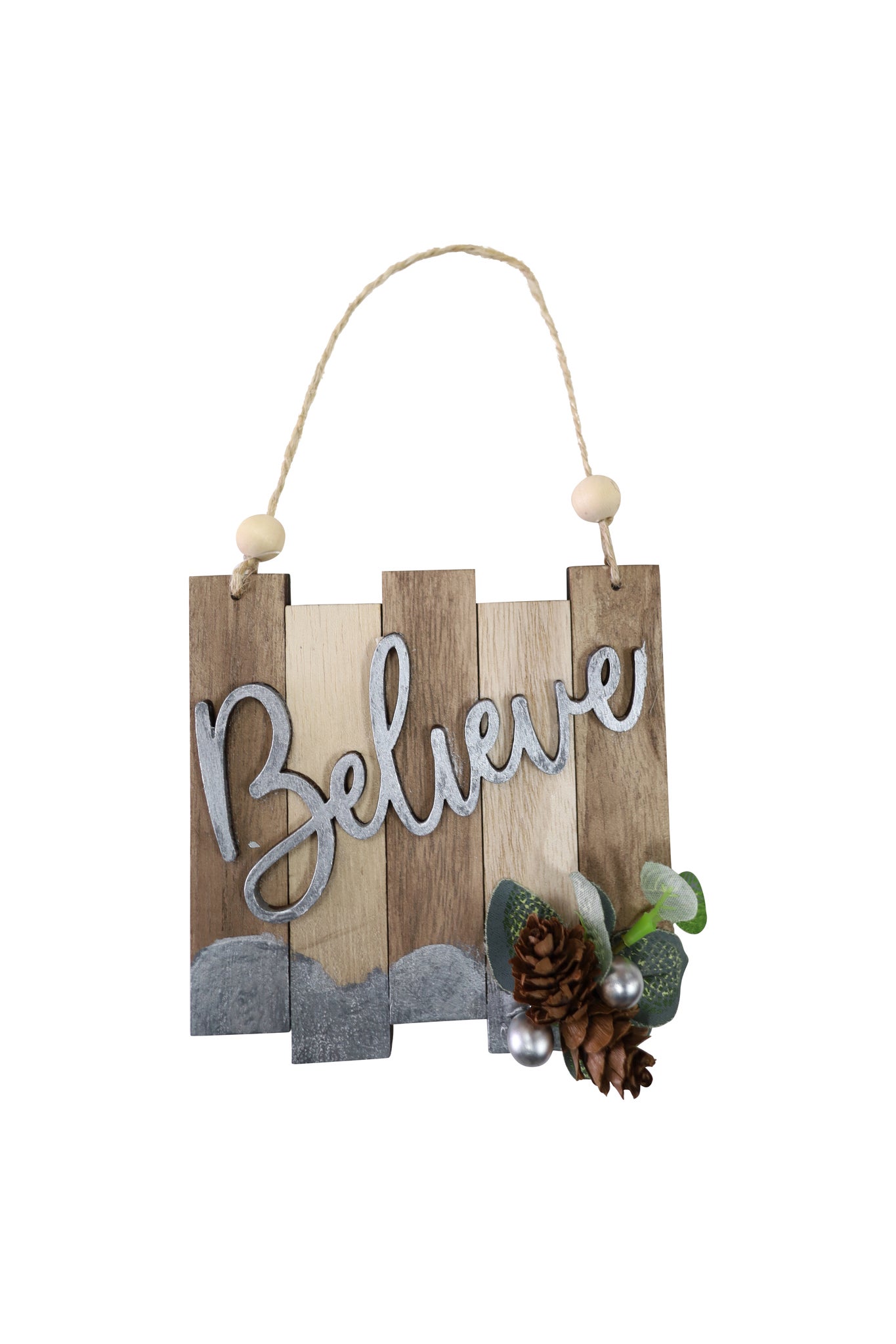 Bring rustic charm to your holiday dcor with this wooden Believe ornament. Designed with a natural wood plank background, metallic script lettering, and festive pinecone and greenery accents, it blends cozy farmhouse style with seasonal cheer. Perfect for trees, wreaths, or garlands, it adds a warm and welcoming touch to Christmas decorating.