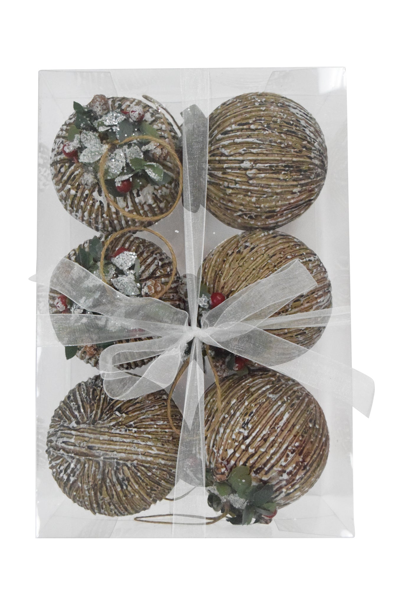 Add a touch of rustic elegance to your holiday decor with this set of ball ornaments. Each ornament features a textured finish with frosted greenery and berry accents, creating a festive and natural look. Perfect for decorating trees, wreaths, or garlands, this 6-piece set comes neatly boxed and ready for gifting or easy storage.