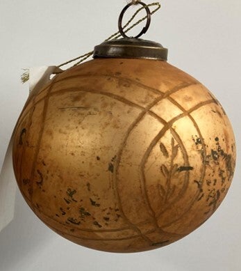 This elegant glass ornament features a geometric-etched design with a warm antique gold finish. Perfect for adding rustic sophistication to holiday trees, garlands, and wreaths.