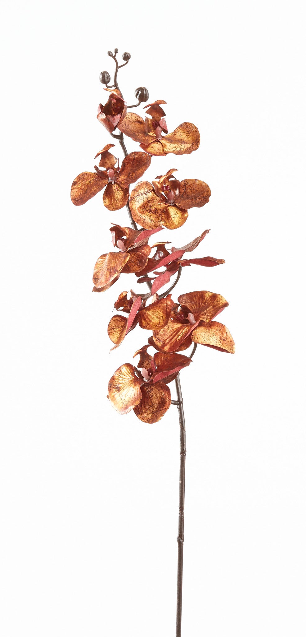 This striking artificial phalaenopsis orchid stem showcases velvety burgundy petals accented with rich gold highlights for an elegant, upscale touch. At 40 inches tall, its perfect for adding height and drama to floral arrangements, event centerpieces, or seasonal décor. The lifelike design and flexible stem make it easy to style in both tall vases and creative displays.