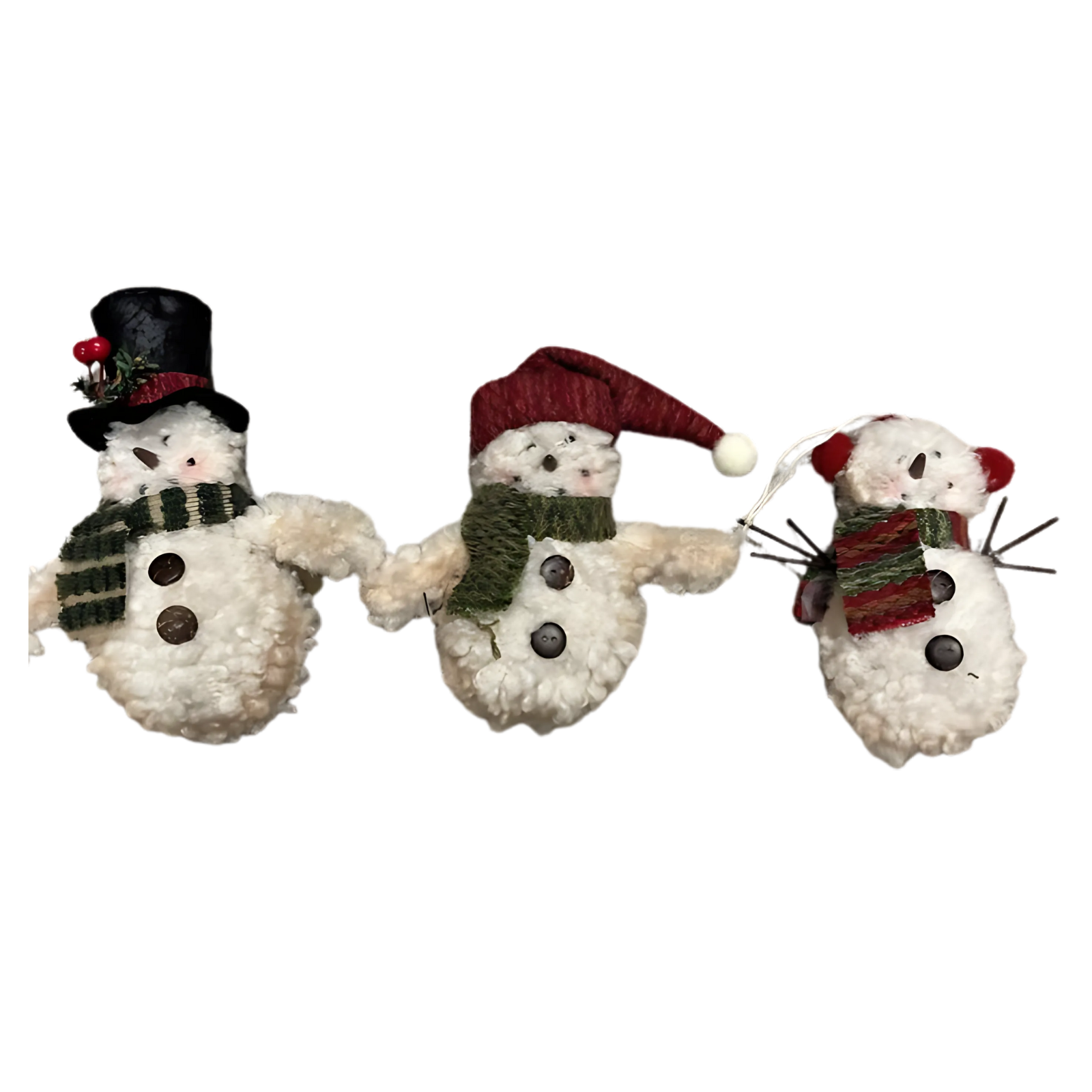 These 5" assorted snowman ornaments are the perfect cozy touch for your holiday tree! Each snowman features soft boucle fabric, rustic buttons, and festive winter accessories like plaid scarves, hats, and twig arms. A charming addition to Christmas trees, garlands, or gift wrapping!