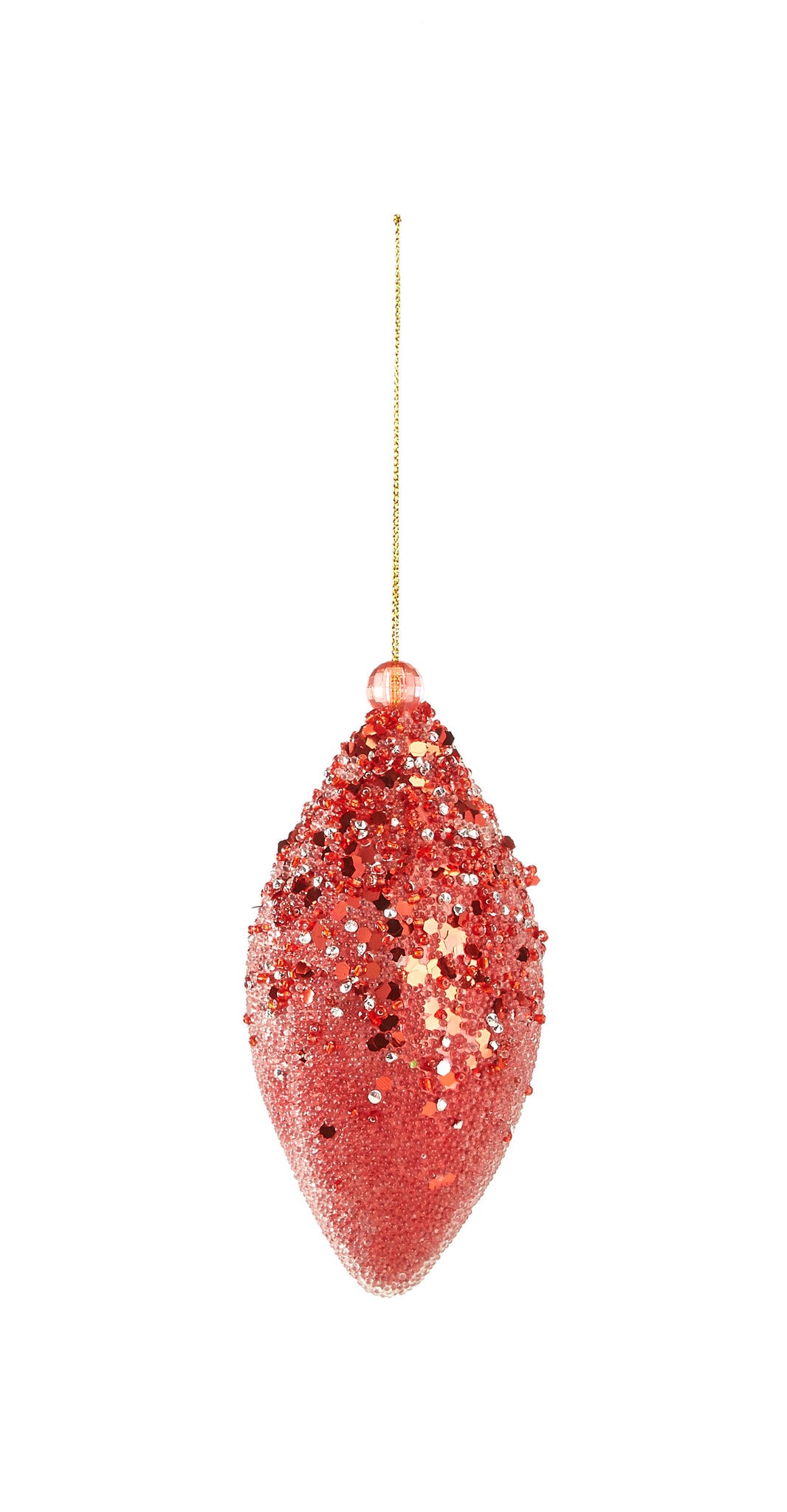 Elevate your holiday décor with this elegant drop ornament accented with sparkling glitter and shimmering bead details. Its elongated shape adds a touch of sophistication, while the glittering finish reflects light beautifully on any tree or seasonal display. Lightweight and easy to hang, its a festive accent available in multiple colors to suit your holiday style.