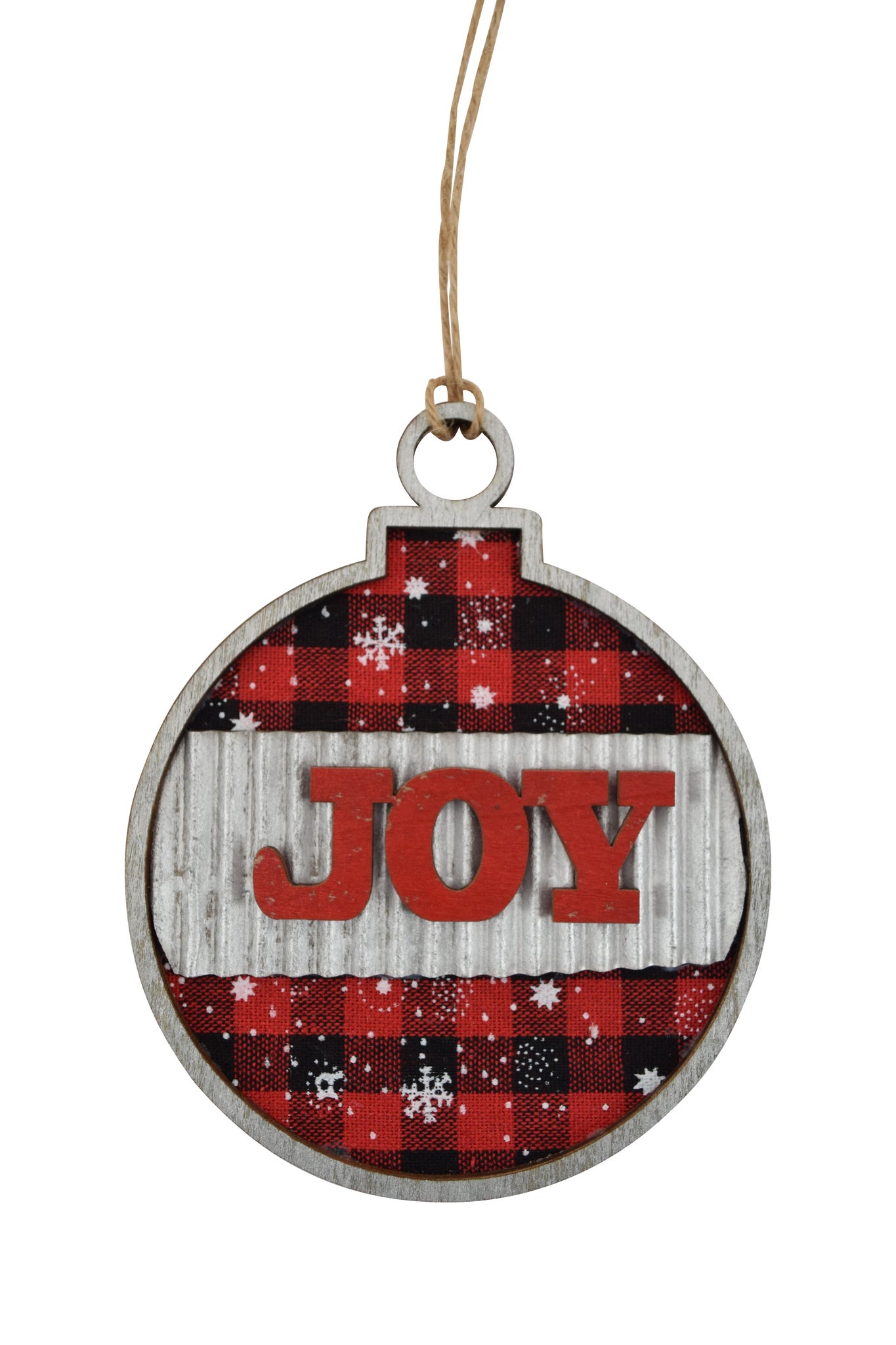 Bring festive cheer to your tree with this Joy ornament. Featuring a bold buffalo plaid background accented with snowflakes and the word "Joy" in striking red, it blends traditional holiday style with rustic farmhouse charm. Perfect for adding a warm, inviting touch to your seasonal décor.