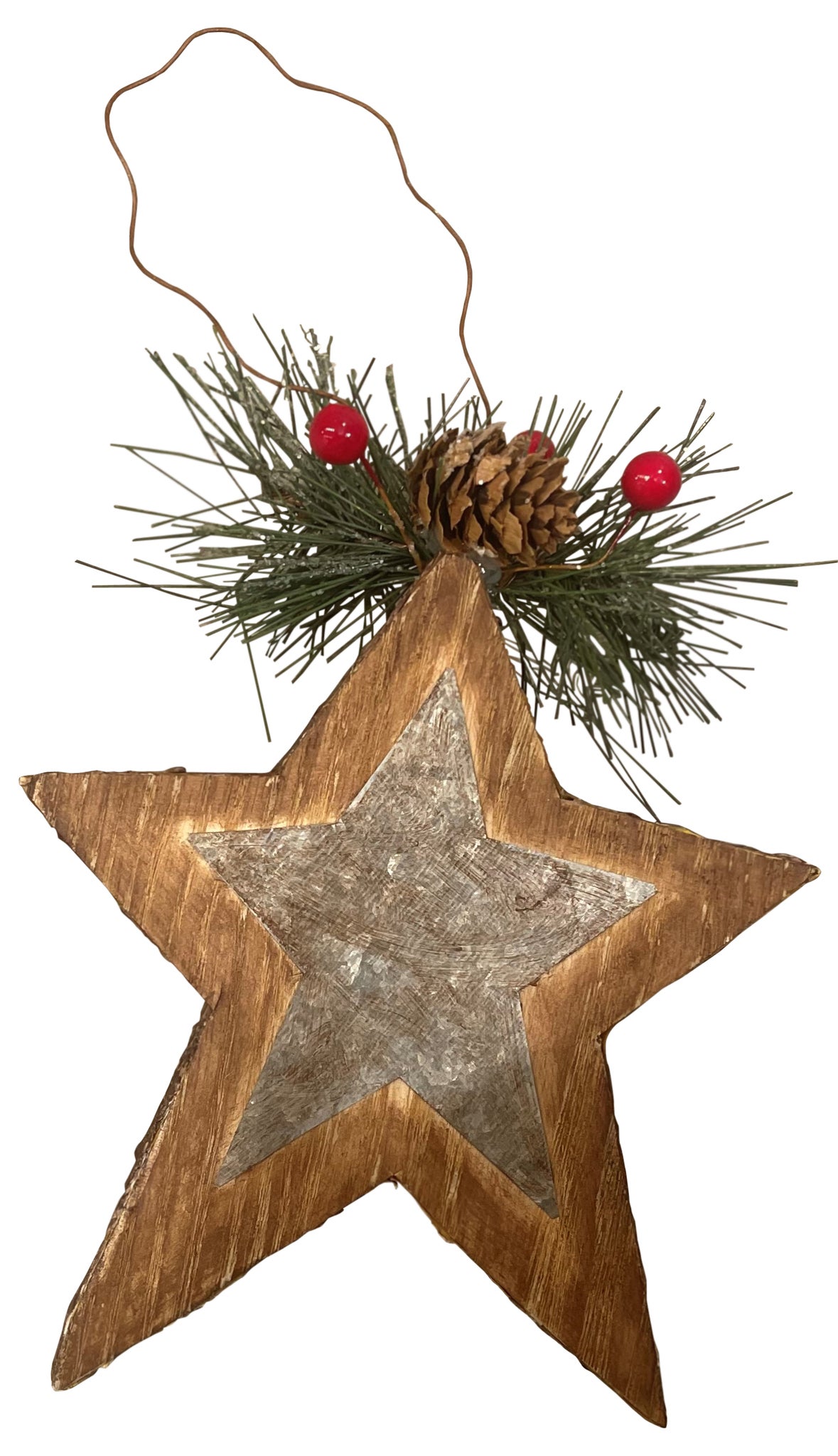 A rustic wooden star ornament featuring a natural finish and festive greenery with pinecones and red berries. Complete with a hanger, its perfect for adding a charming holiday touch to your tree, wreath, or wall decor.