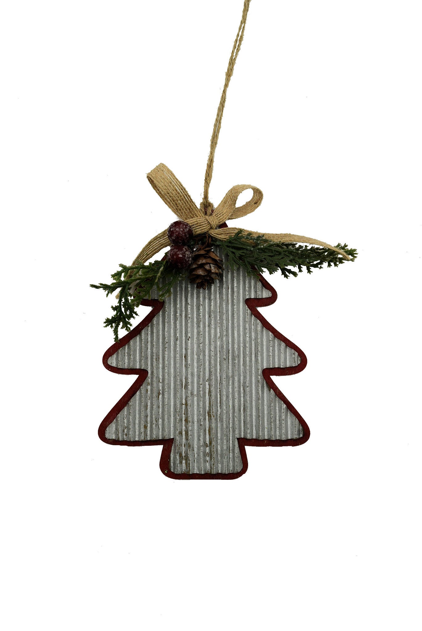 Bring rustic holiday charm to your décor with this pine tree ornament, crafted with a corrugated metal finish and accented by a festive bow, pinecone, and greenery. The natural textures and warm details make it a perfect addition to farmhouse or traditional Christmas themes. Hang it on your tree, wreath, or garland for a cozy seasonal touch.