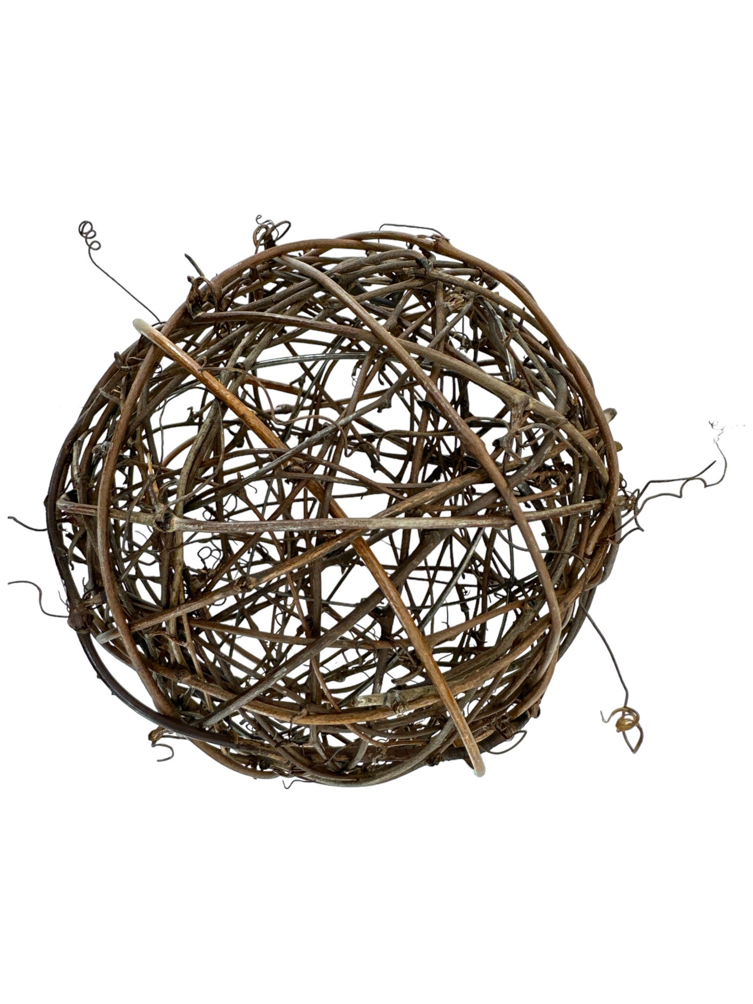This vine ball is crafted from natural vines intricately woven into a spherical shape. It is often used as a decorative element in home decor, event styling, and crafting projects. Its organic appearance and earthy texture make it ideal for centerpieces, hanging decor, or as part of a floral arrangement. The vine ball adds a rustic and natural aesthetic to any setting.