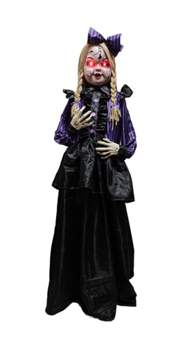 Turn up the terror with this 67-inch animated walking girl doll, dressed in a gothic purple and black outfit with glowing red eyes and eerie movement. As she creeps forward, she lets out chilling phrases and sounds, making her an unforgettable addition to haunted house scenes or Halloween walk-throughs. A spooky showstopper that brings your display to lifeliterally.