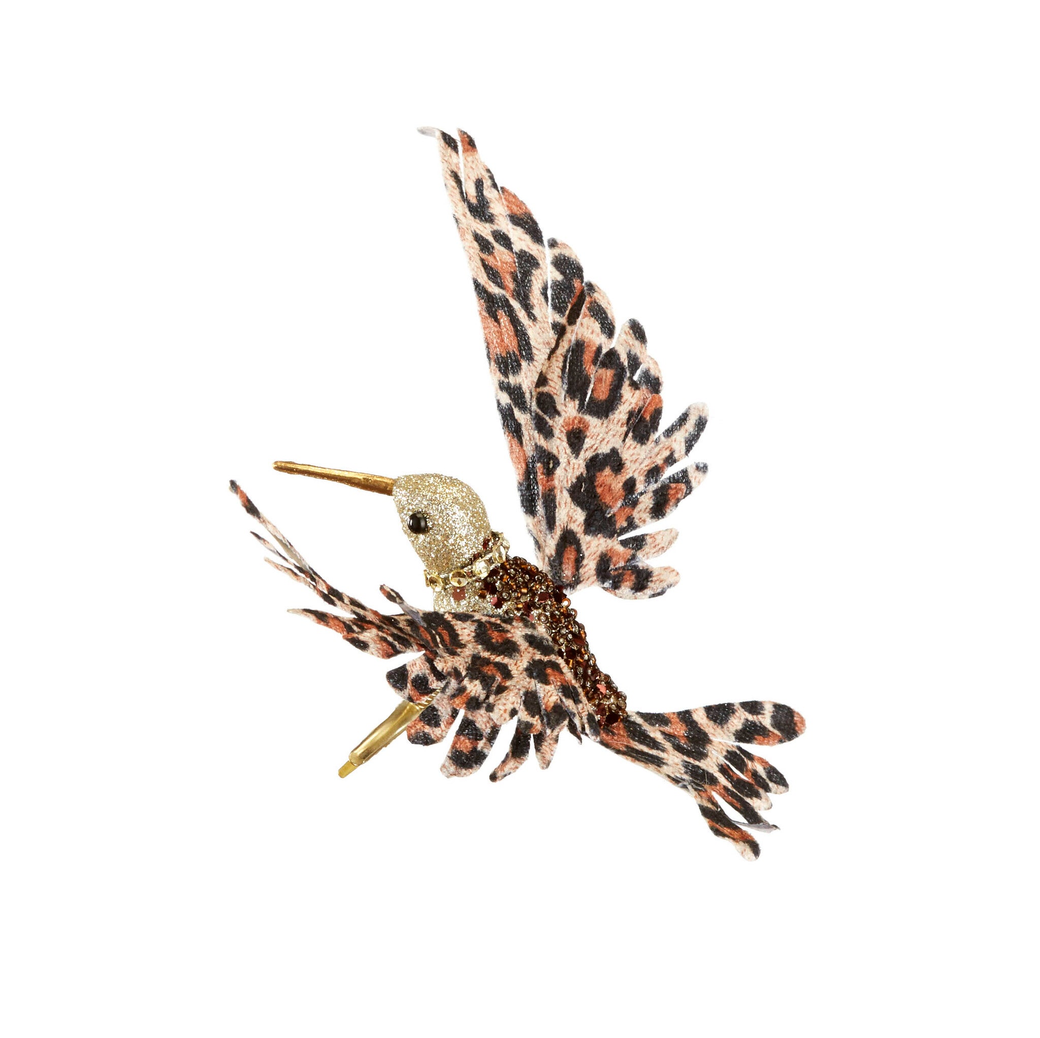 Bring bold style to your holiday decor with this glitter and bead hummingbird ornament featuring striking leopard print wings. Its detailed design and shimmering accents make it a unique addition to trees, garlands, or seasonal displays. Lightweight and eye-catching, it adds a touch of glamour and personality to festive decorating.