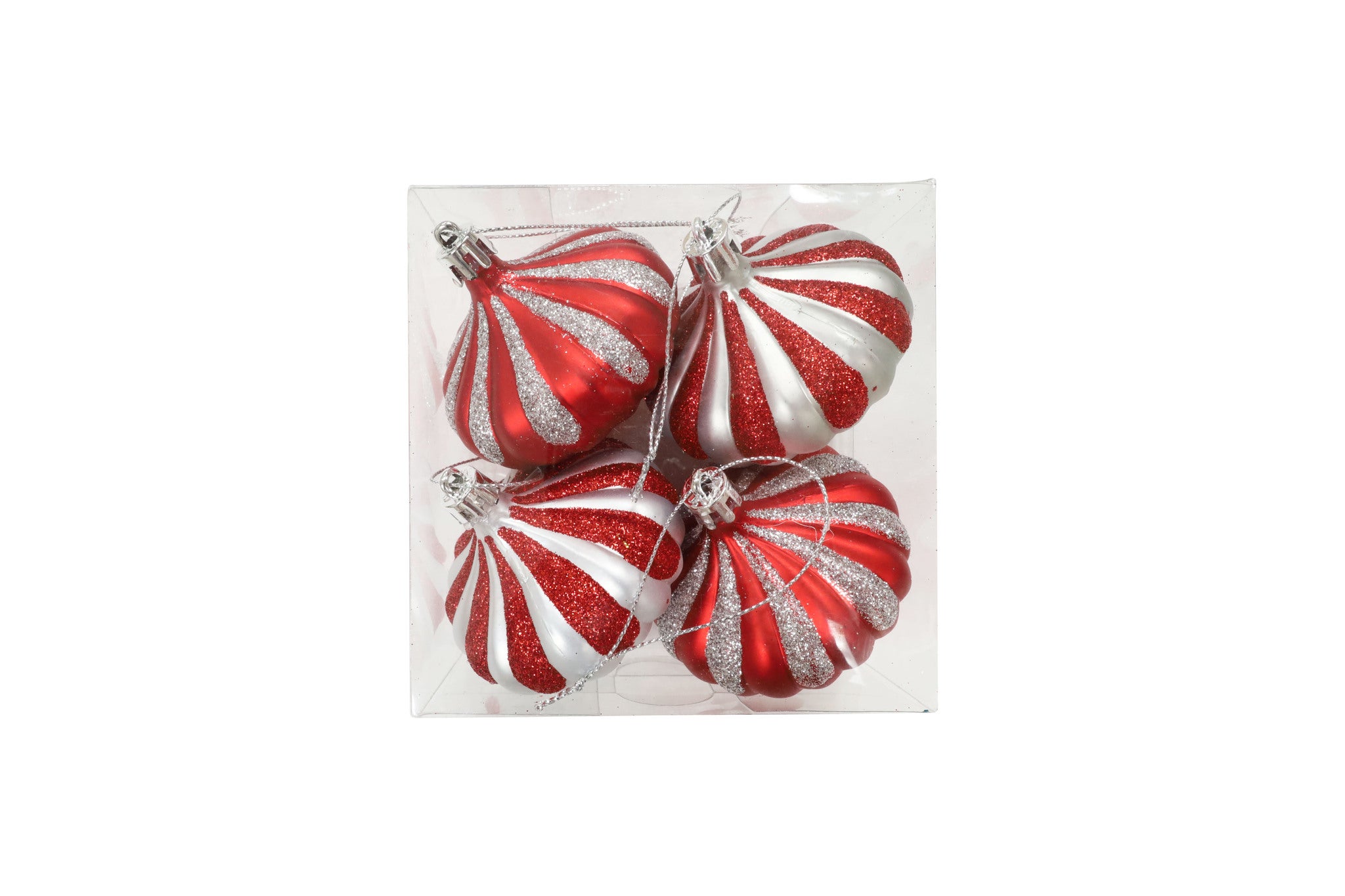 Bring festive cheer to your tree with this set of 4 plastic ornaments designed in a candy caneinspired red, white, and silver swirl. Each 70mm ornament sparkles with glitter accents, adding a fun and whimsical holiday touch. Lightweight and shatterproof, theyre perfect for trees, garlands, or wreaths.