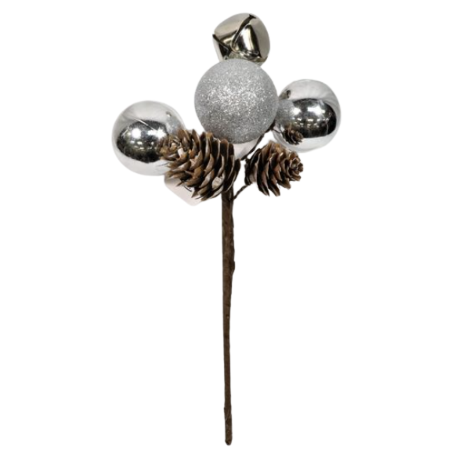 Add festive charm to your holiday decorating with this 8.5-inch ornament pick. Featuring silver balls, a glittered accent, natural pinecones, and a shiny bell, it creates the perfect mix of rustic and modern holiday style. Ideal for enhancing wreaths, garlands, or centerpieces with seasonal sparkle.
