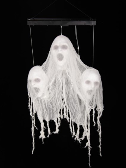 Create a chilling centerpiece with this trio of floating ghost skulls, draped in tattered white gauze for a hauntingly ethereal effect. Each skull features glowing eyes and eerie sound effects as they sway and move, giving the illusion of spirits suspended midair. Perfect for hanging indoors or on a covered porch to amplify your haunted ambiance.