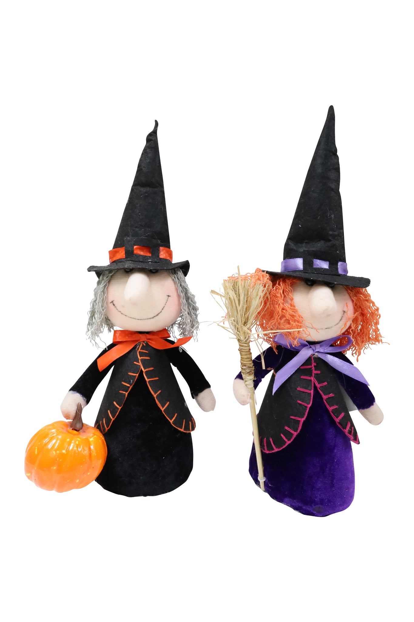 Add a whimsical touch to your Halloween dcor with this set of two 11.8-inch witch figurines. Each features a classic pointed hat and festive detailsone holding a pumpkin and the other a broomperfect for displaying on shelves, mantels, or entryway tables.