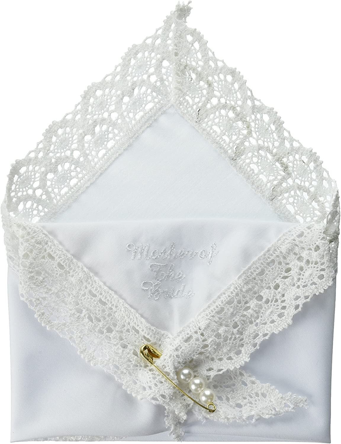 This beautiful hankie is embossed with the words "Mother of the Bride" and is accented with a pearl embellished gold pin. The handkerchief is the perfect keepsake to cherish for years after the celebration.