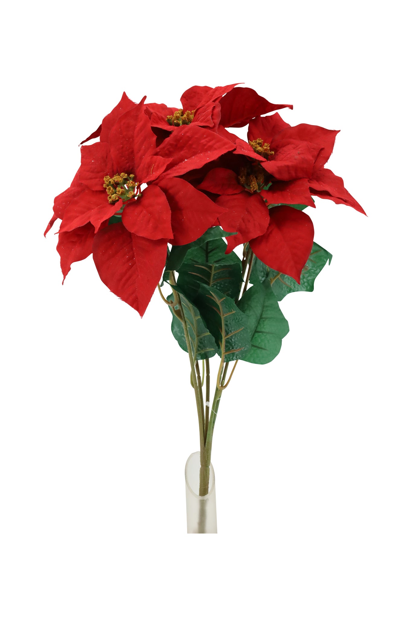 This bold artificial poinsettia bush features five lush red blooms with realistic veined leaves. Perfect for adding height and festive color to large arrangements, urns, or floor vases during the holiday season.