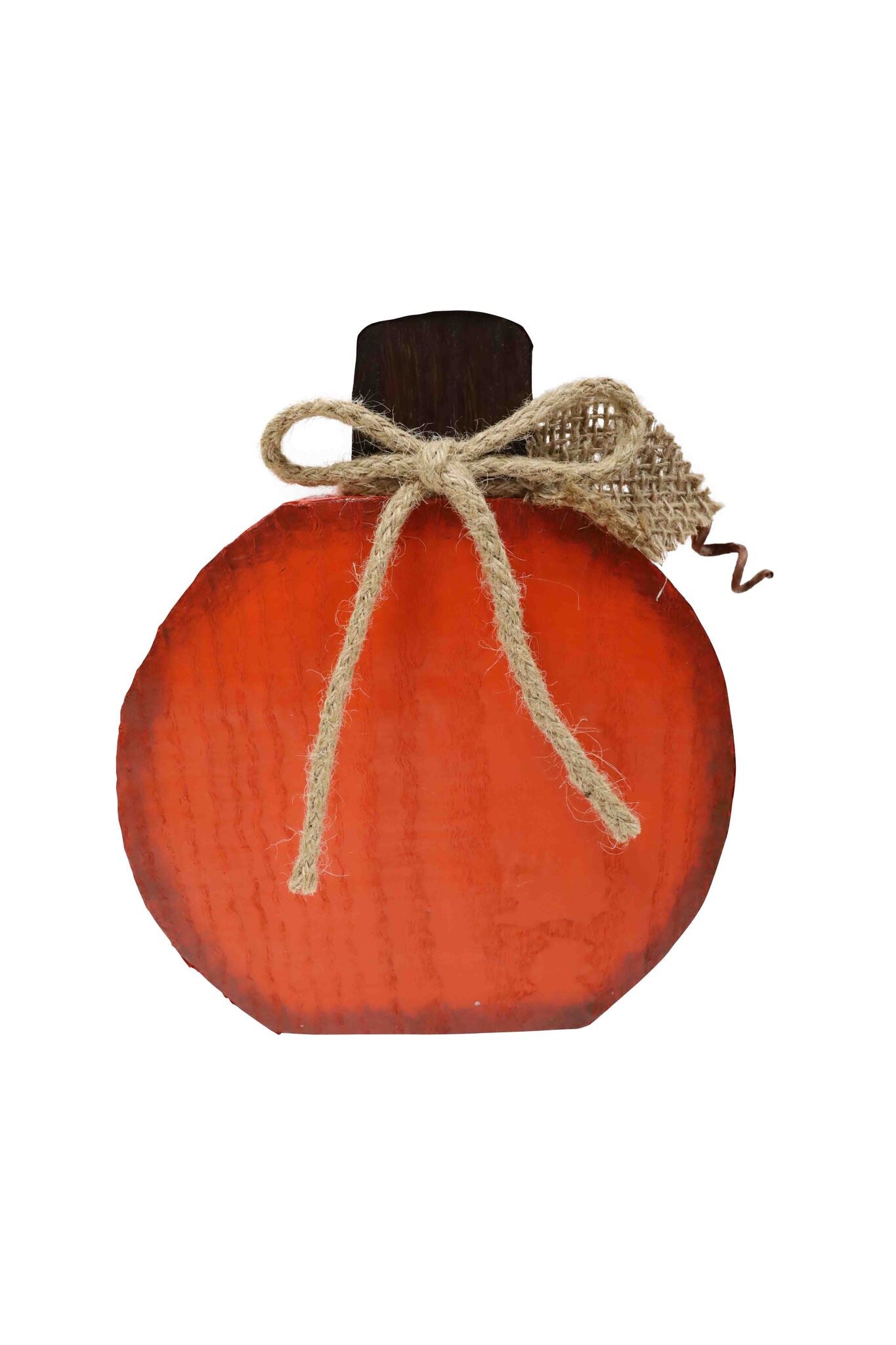 Bring cozy fall charm to your home with this 7.87-inch rustic wooden pumpkin. Featuring a warm orange finish, natural jute bow, and twig accent, its perfect for tabletop displays, shelves, or entryway decor all season long.